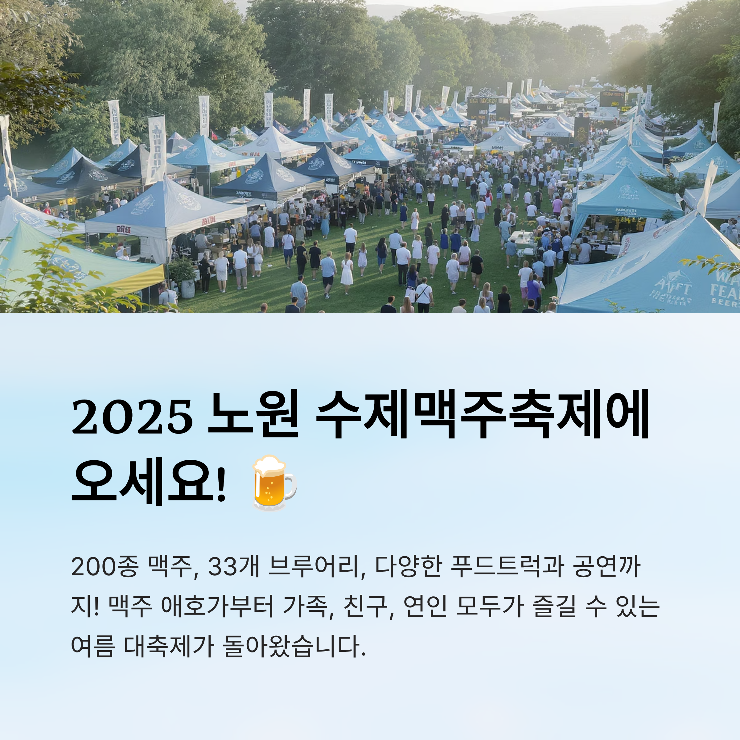 노원구를 대표하는 여름의 대축제, 바로 2025 노원 수제맥주축제가 돌아왔어요! 올해는 무려 200종의 맥주와 33개 브루어리가 참여하고, 다양한 푸드트럭과 공연까지 준비되어 있어요. 맥주 애호가뿐만 아니라 가족, 친구, 연인 누구나 즐길 수 있는 흥겨운 현장이 될 예정이에요. 🍻