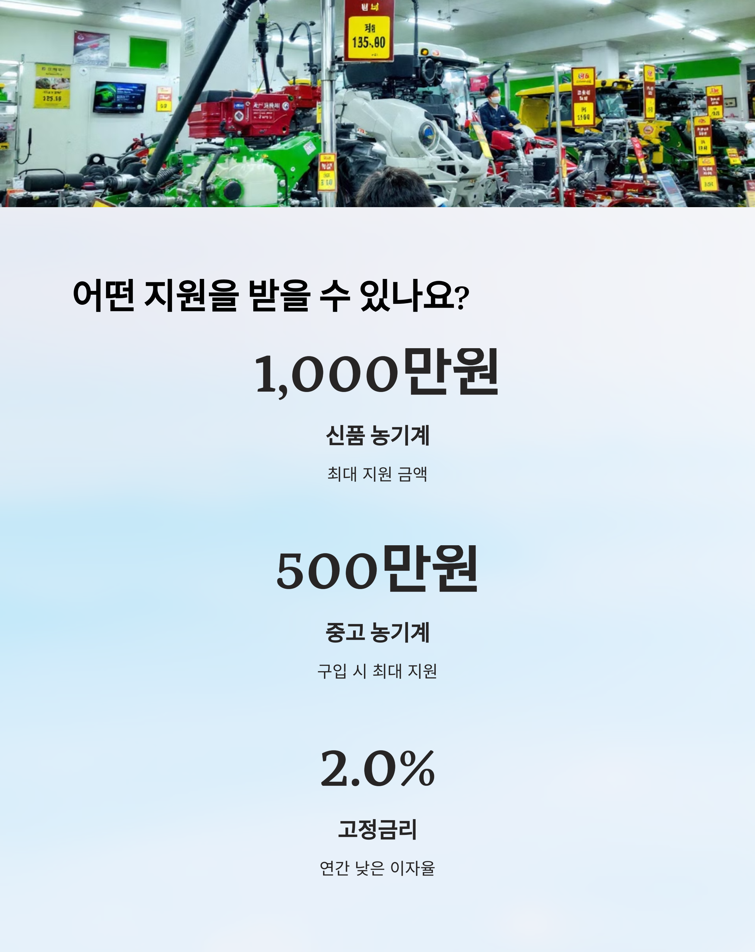 두 번째는 **융자 지원**이에요. 이자는 정부가 부담하고, 농업인은 원금만 나눠서 갚는 구조죠. 고가의 대형기계(트랙터, 콤바인 등)에 적합하고, 상환 기간은 5년 이내 무이자가 많아요.