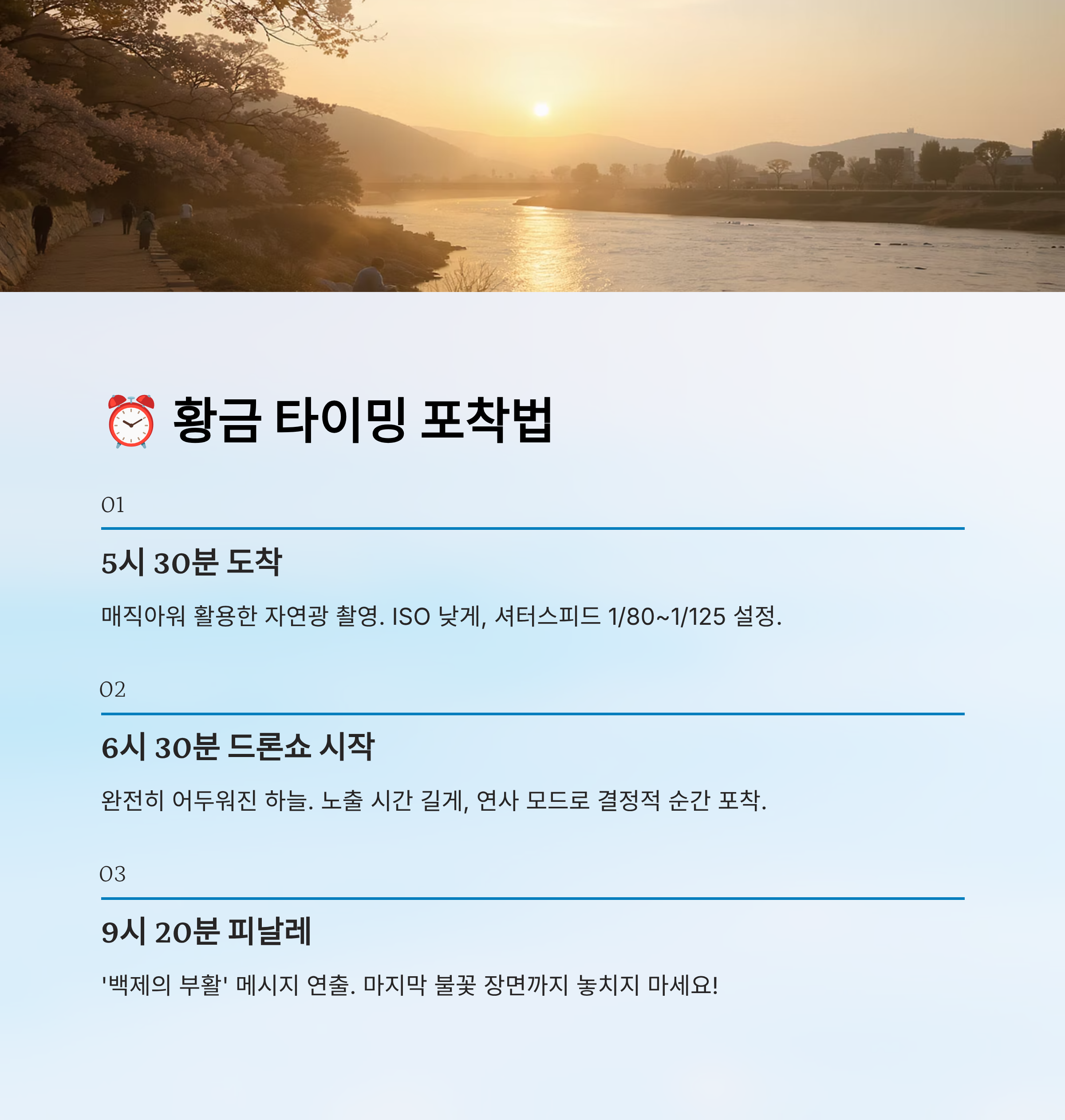 여기서부터는 진짜 ‘찐 고수’들만 알고 있는 백제문화제 드론쇼 숨은 팁을 공개할게요. 이 팁들만 잘 활용해도 사람 많은 축제 속에서도 여유롭게, 더 멋지게, 더 편하게 즐길 수 있어요. 특히 사진 찍는 분들이나 아이 동반 가족이라면 이 내용은 필독이에요! 📌