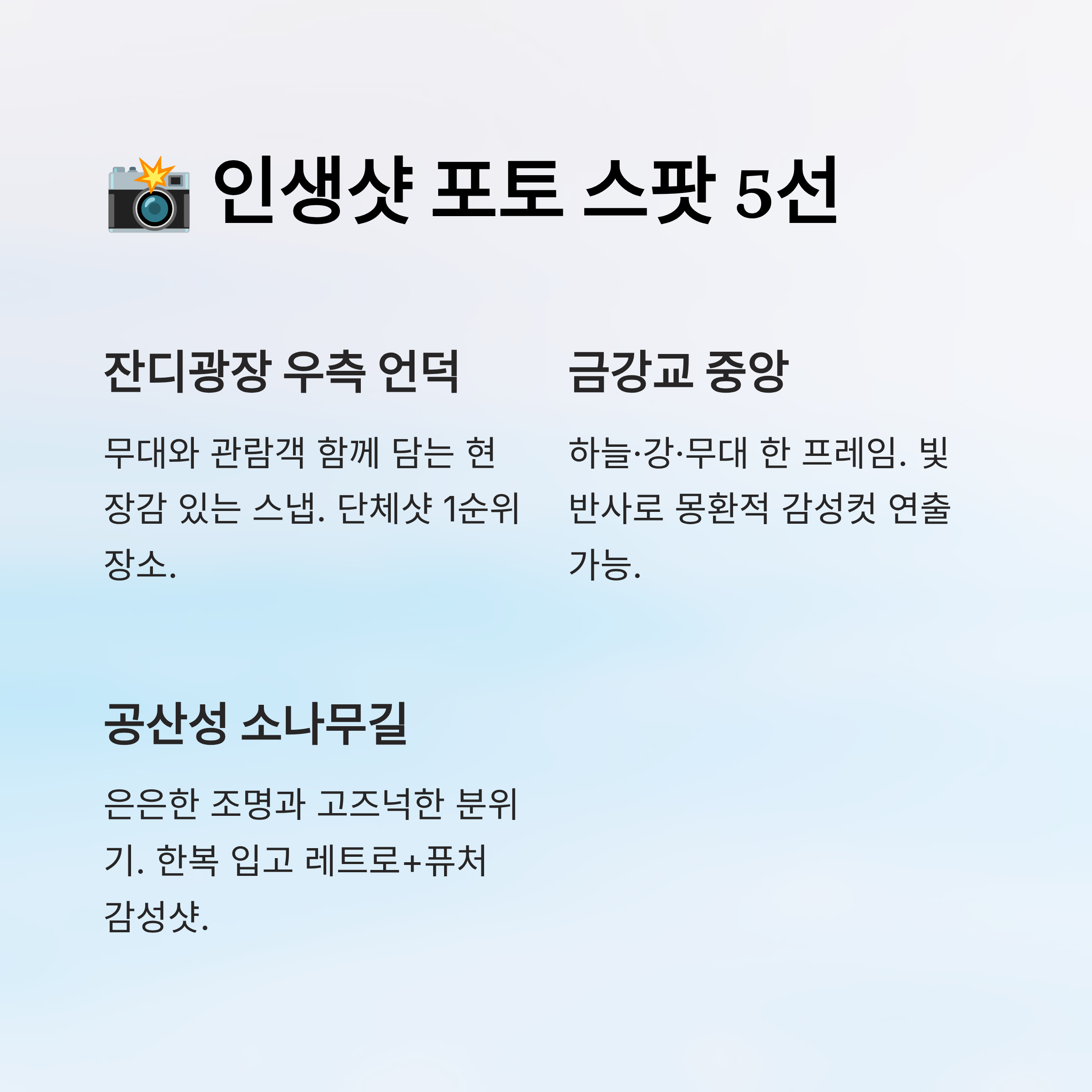요약하면, 공연 감상 중심이면 무대 앞, 사진과 조용한 분위기 원하면 공산성, SNS용 감성컷은 금강교가 최고예요. 어떤 관람이 목적이냐에 따라 명당도 달라지니 미리 동선 체크하고 움직이는 게 좋아요. 📍📷