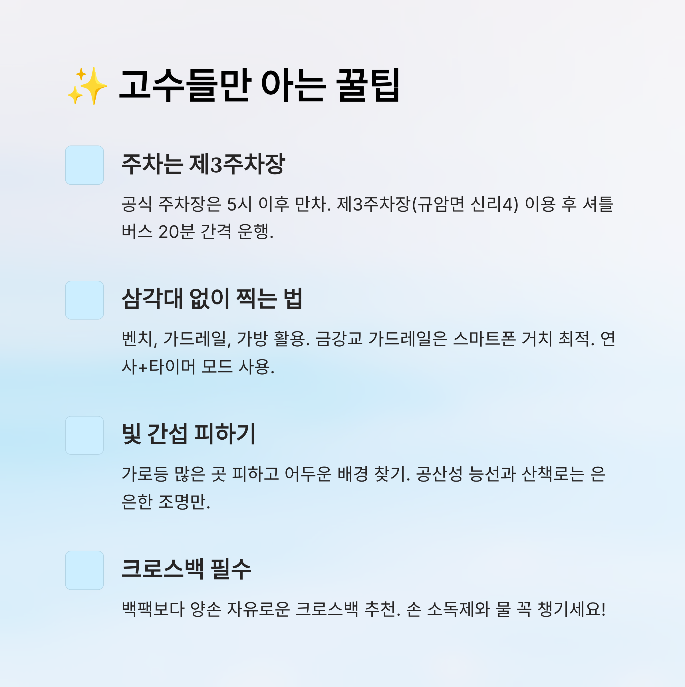 📷 삼각대 없이 찍는 법: 삼각대가 없다고 포기하지 마세요! 벤치, 전신주, 가방, 사람 어깨(!) 등 고정할 수 있는 모든 곳을 이용하세요. 특히 금강교 위 가드레일은 스마트폰 거치하기에 딱 좋아요. 연사 모드+타이머를 활용하면 흔들림 없이 예쁜 장면을 담을 수 있어요.