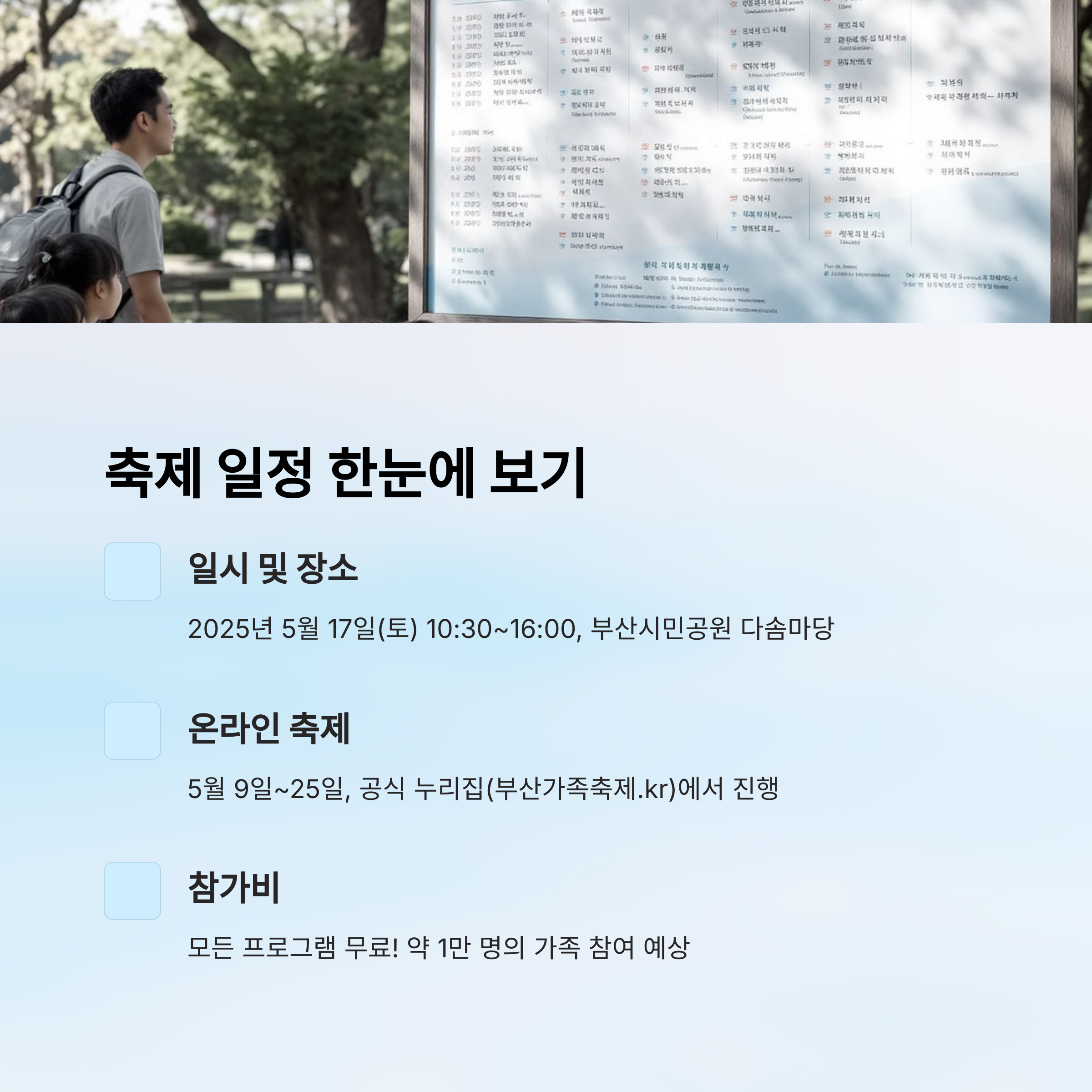 2025년 5월 9일부터 5월 25일까지 공식 누리집 부산가족축제.kr에서 다양한 온라인 프로그램을 즐길 수 있답니다. 🥳