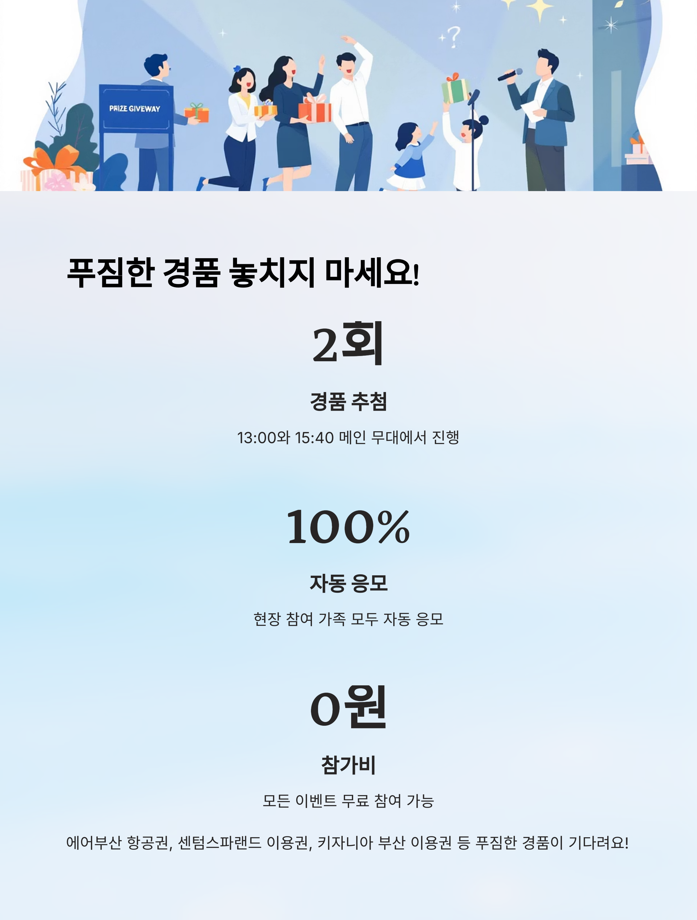 이번 축제에서는 현장을 찾은 가족들을 위해 정말 푸짐한 경품이 준비되어 있어요. 특히 에어부산 항공권부터 센텀스파랜드, 키자니아 부산 이용권까지! 여행과 휴식, 놀이를 한 번에 잡을 수 있는 기회가 기다리고 있답니다. ✈️🛁🎡