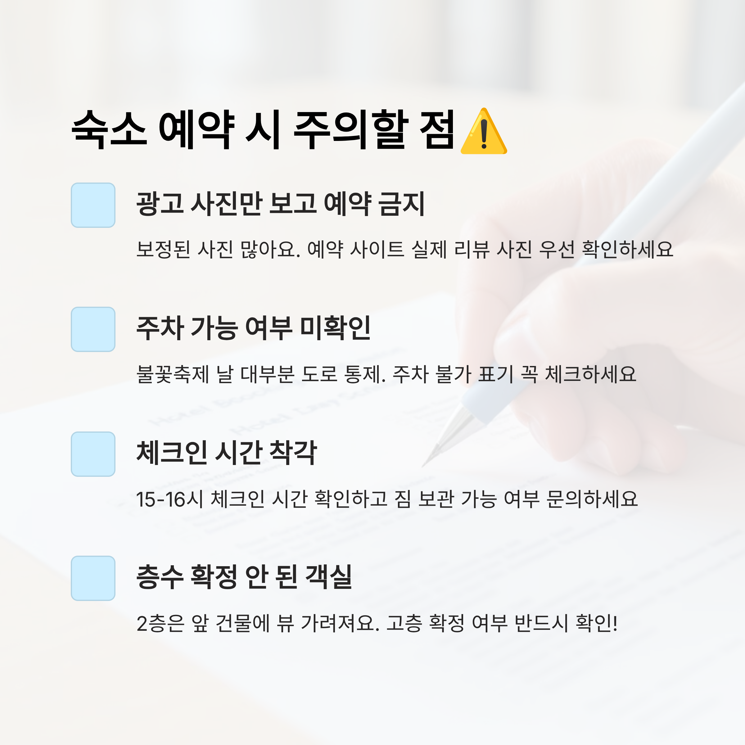 불꽃축제 당일에 실수 한 번이면 기분 망치기 딱 좋아요. 특히 숙소 예약 관련 실수는 현장에서 되돌릴 수 없어서 더 조심해야 해요. 여기에, 자주 발생하는 실수들과 꼭 피해야 할 주의사항들을 정리해봤어요.💥