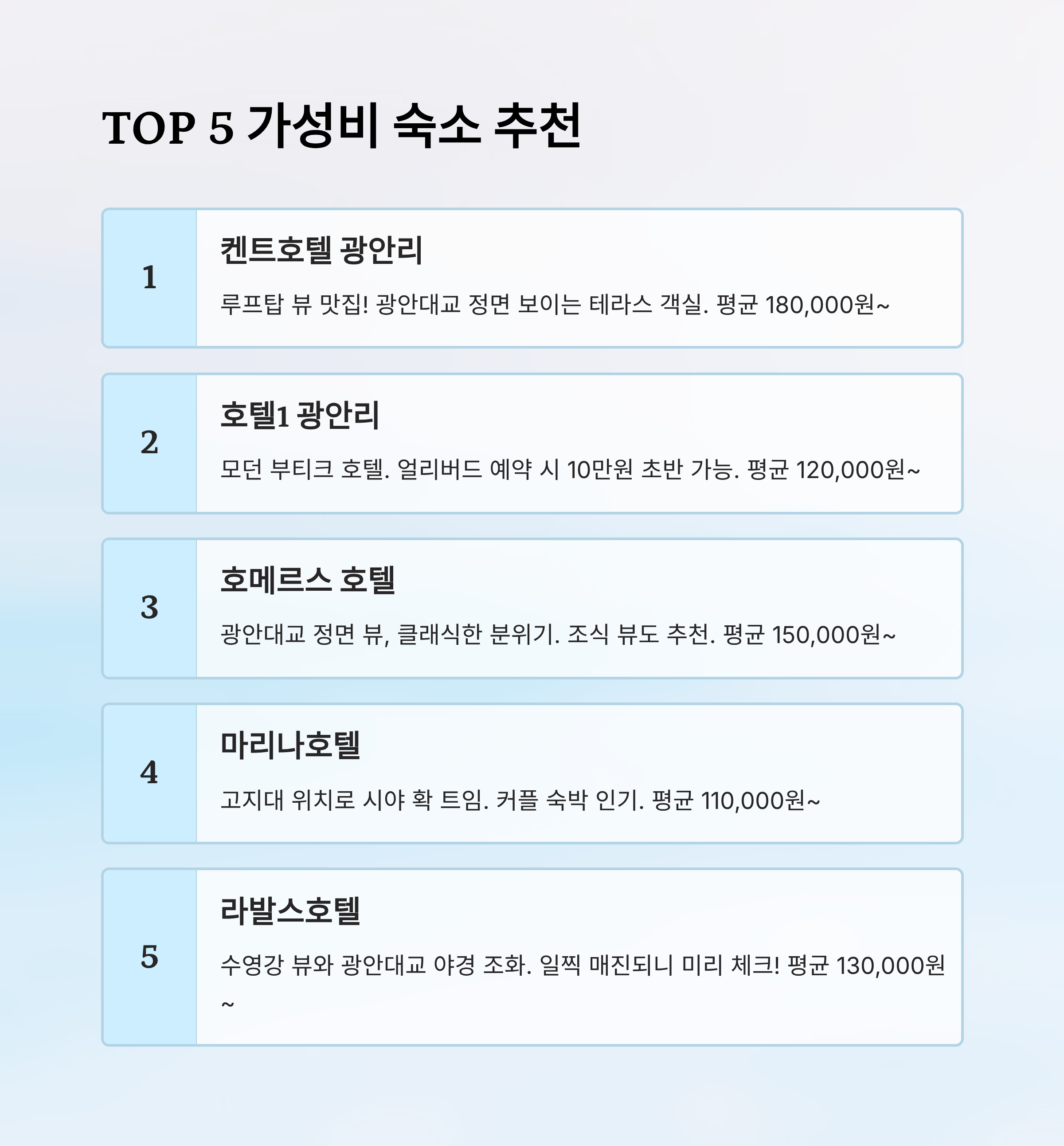 이제 본격적으로 가성비와 오션뷰를 모두 잡을 수 있는 불꽃축제 숙소 5곳을 소개할게요! 아래 숙소들은 광안리 메인 뷰를 확보하면서도 가격 대비 만족도가 높고, 후기 평점도 좋은 곳들이에요. 무작정 비싼 호텔 말고, 제대로 알고 고르자구요! 😉