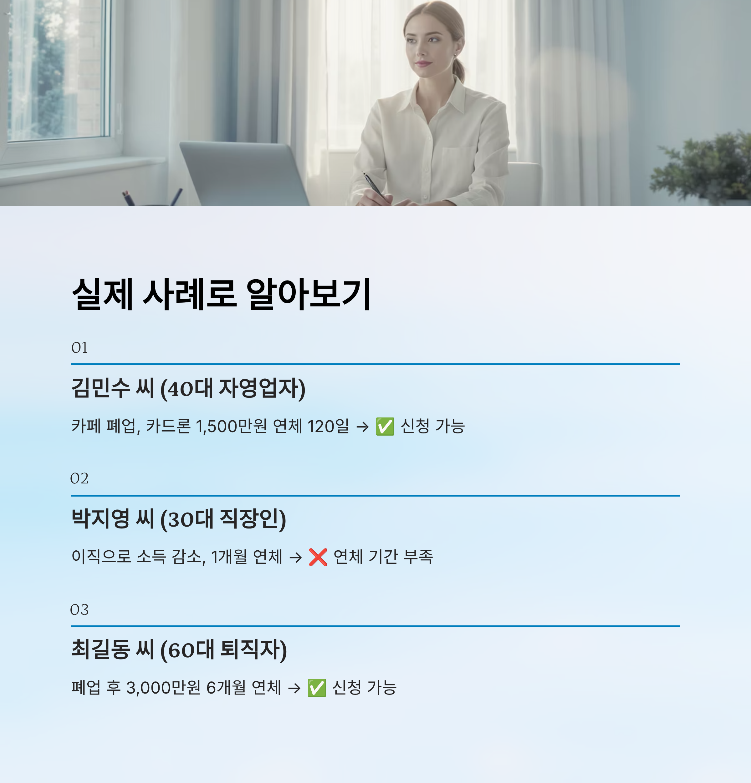 | 필요 조건 | 90일 이상 연체, 소득 감소, 폐업 경험 |