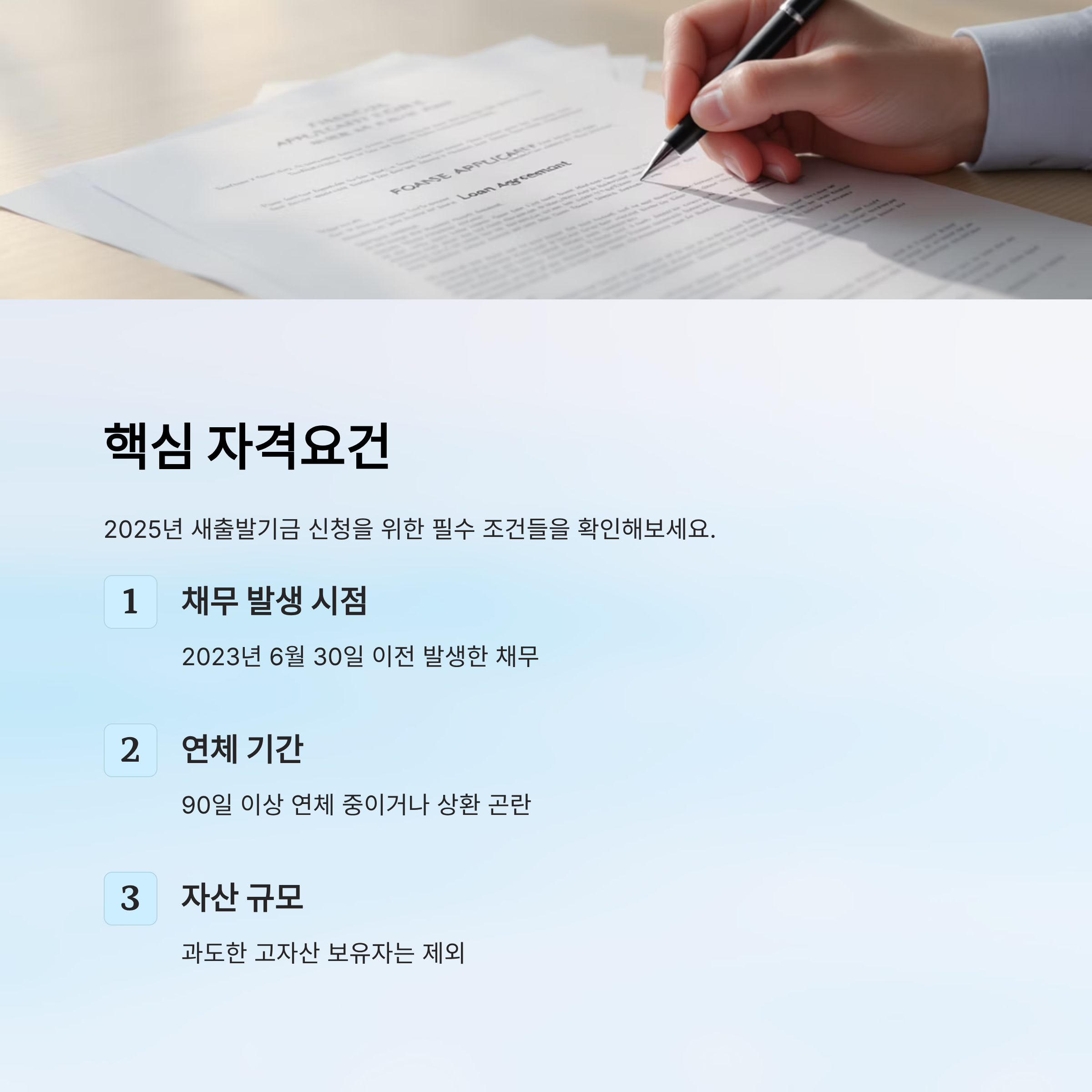 2025년 새출발기금의 핵심 신청 자격은 크게 세 가지로 정리할 수 있어요. 연체 기간, 채무 규모, 현재 상황(소득 또는 영업 여부)이 기준이죠. 특히 90일 이상 연체된 채무가 있는 경우는 사실상 자동 자격 검토 대상이에요.