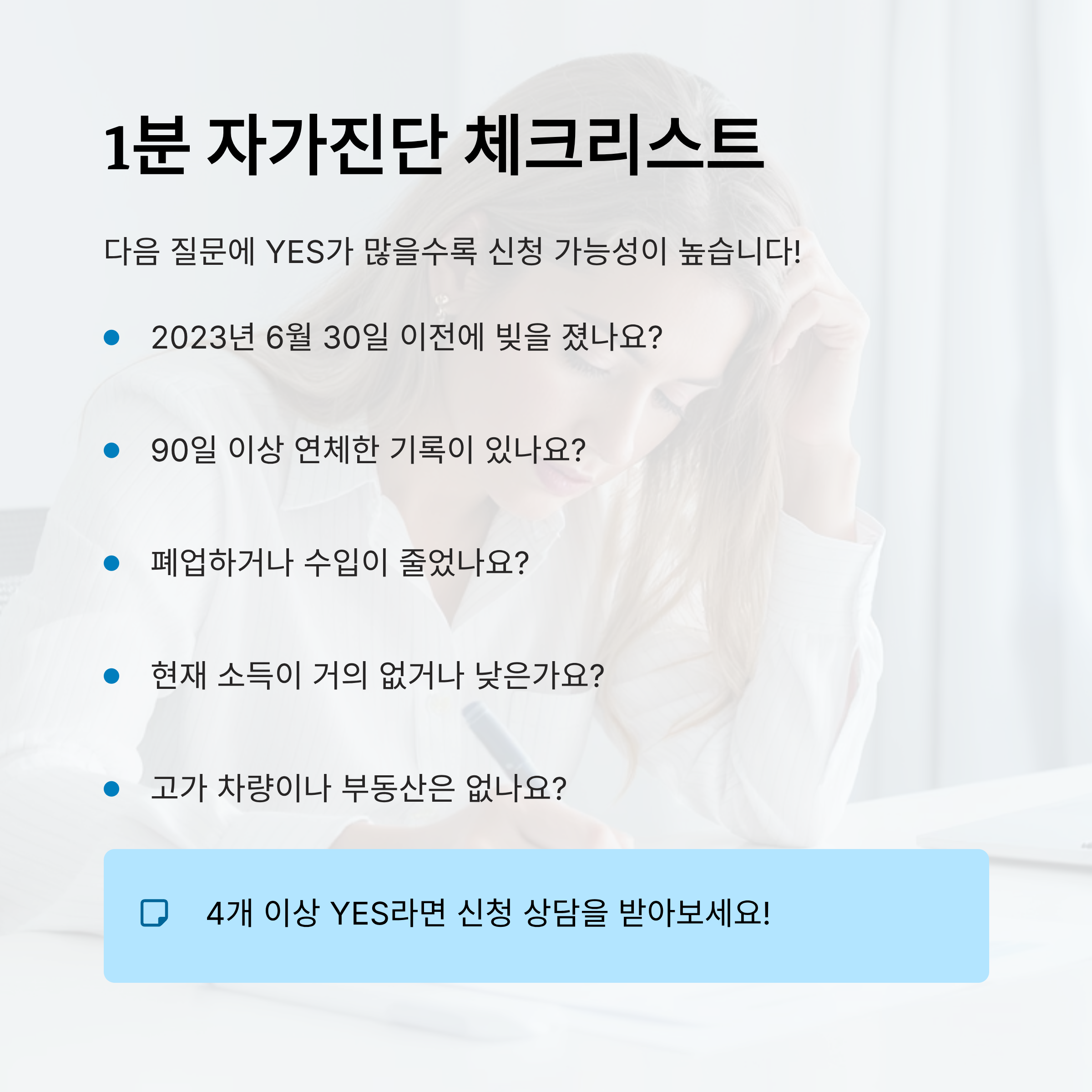 4개 이상 YES라면 신청 상담을 받는 게 좋아요. 실제 심사는 서류와 소명에 따라 달라질 수 있으니, 상담을 통해 확실하게 판단받는 걸 추천해요!