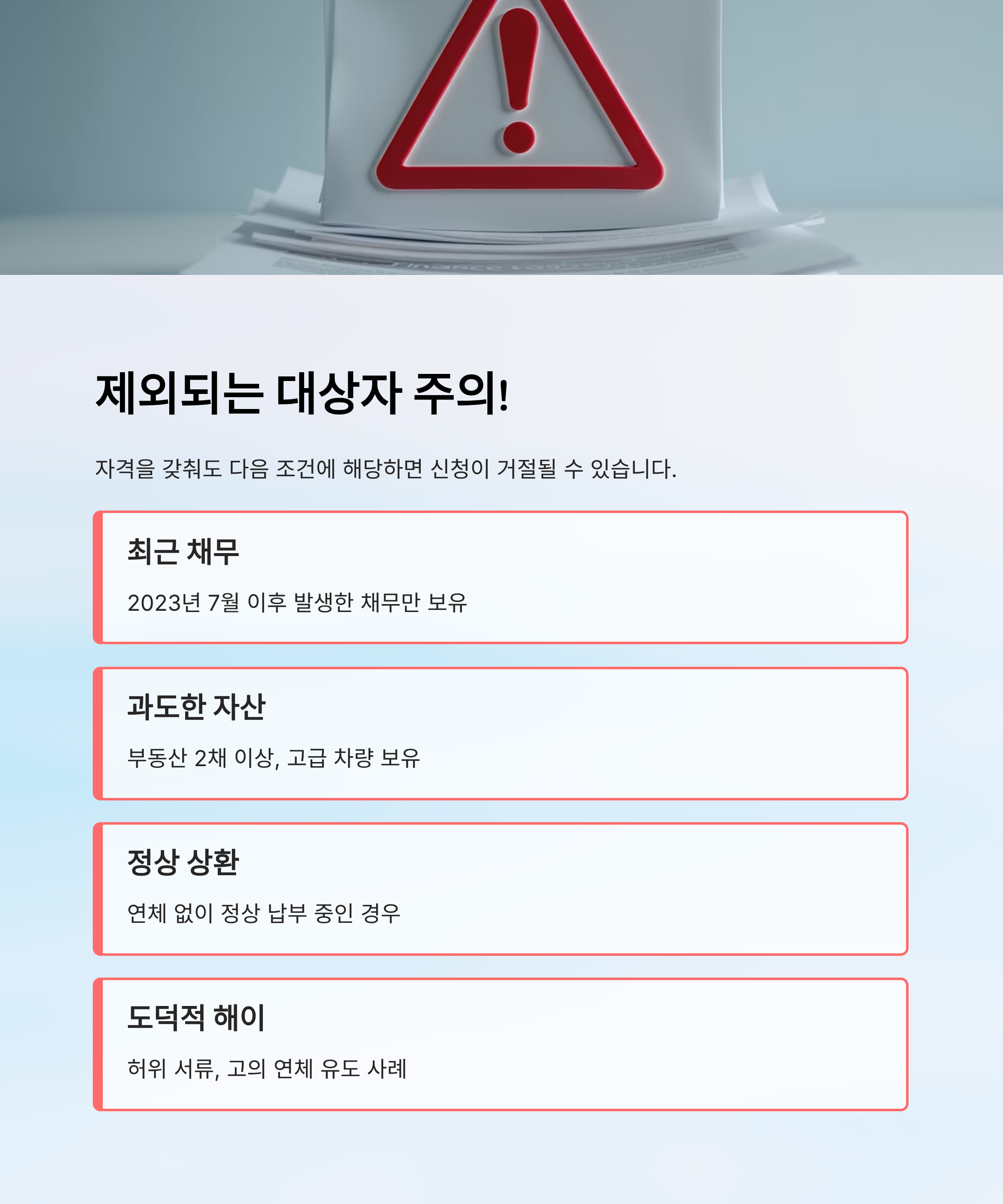 2025년 새출발기금은 누구에게나 열려 있는 제도처럼 보이지만, 실제로는 일부 조건에 해당하면 제외될 수 있어요. “자격 되는 줄 알았는데, 막상 심사에서 탈락했다”는 분들도 많았어요. 그래서 제외 사유를 정확히 아는 게 정말 중요하답니다! ⚠️