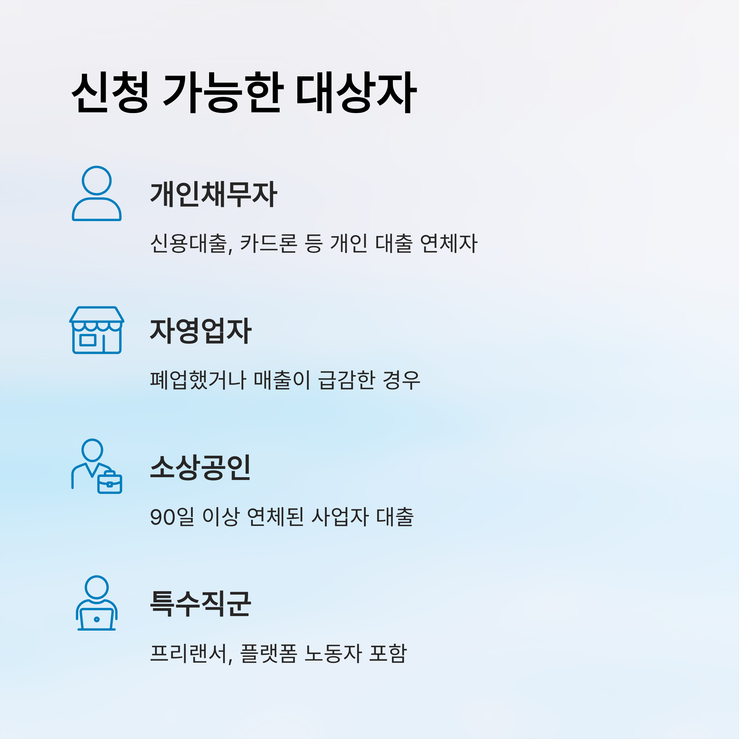 신청 대상자는 단순히 ‘빚이 있다’고 해서 다 되는 건 아니에요. 아래 유형 중 하나에 해당돼야 해요. 개인, 자영업자, 소상공인까지 폭넓게 포함돼 있지만 각자 요건이 다르니 구체적으로 살펴봐야 해요.