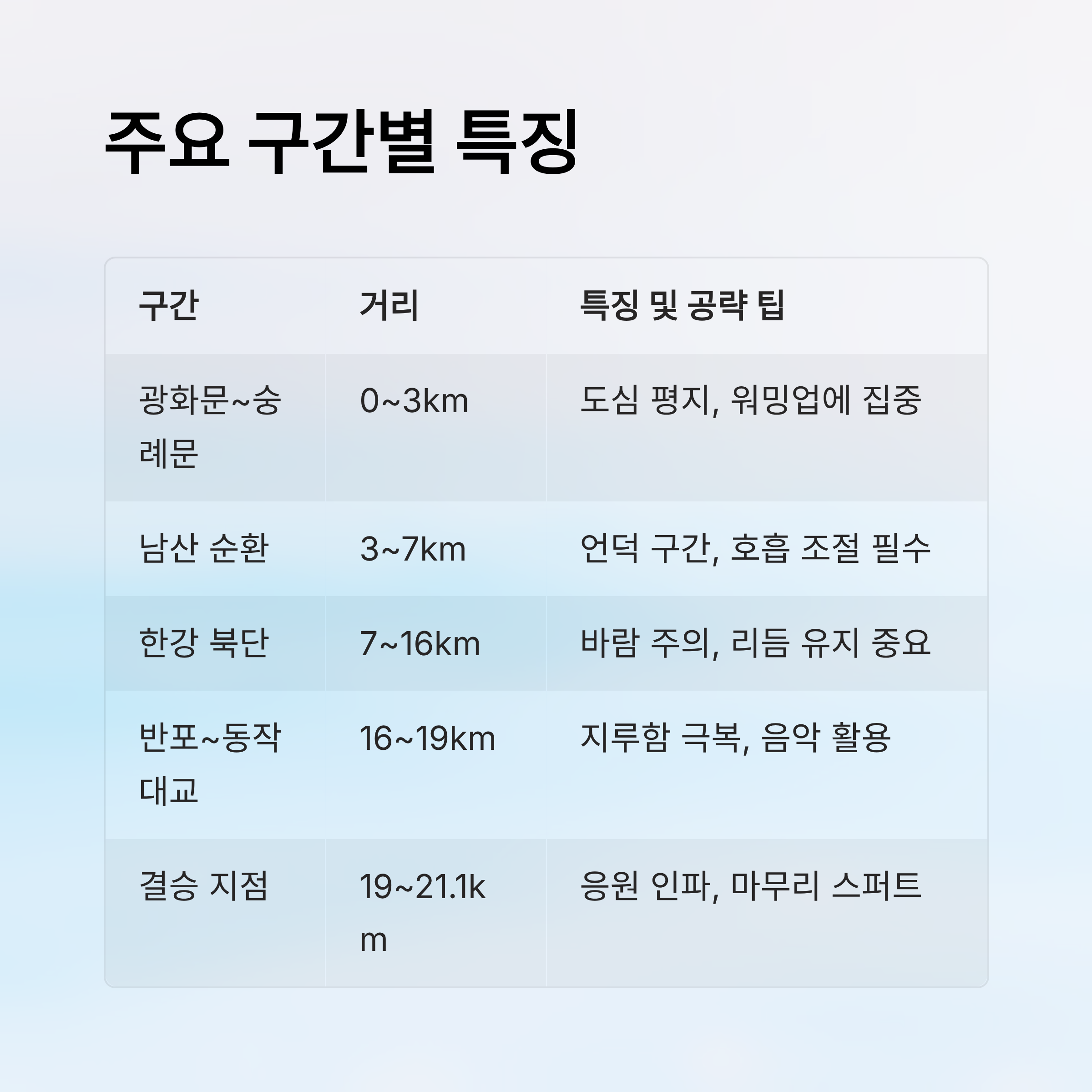 | 광화문~숭례문 | 0~3km | 도심 평지 | 워밍업에 집중 |