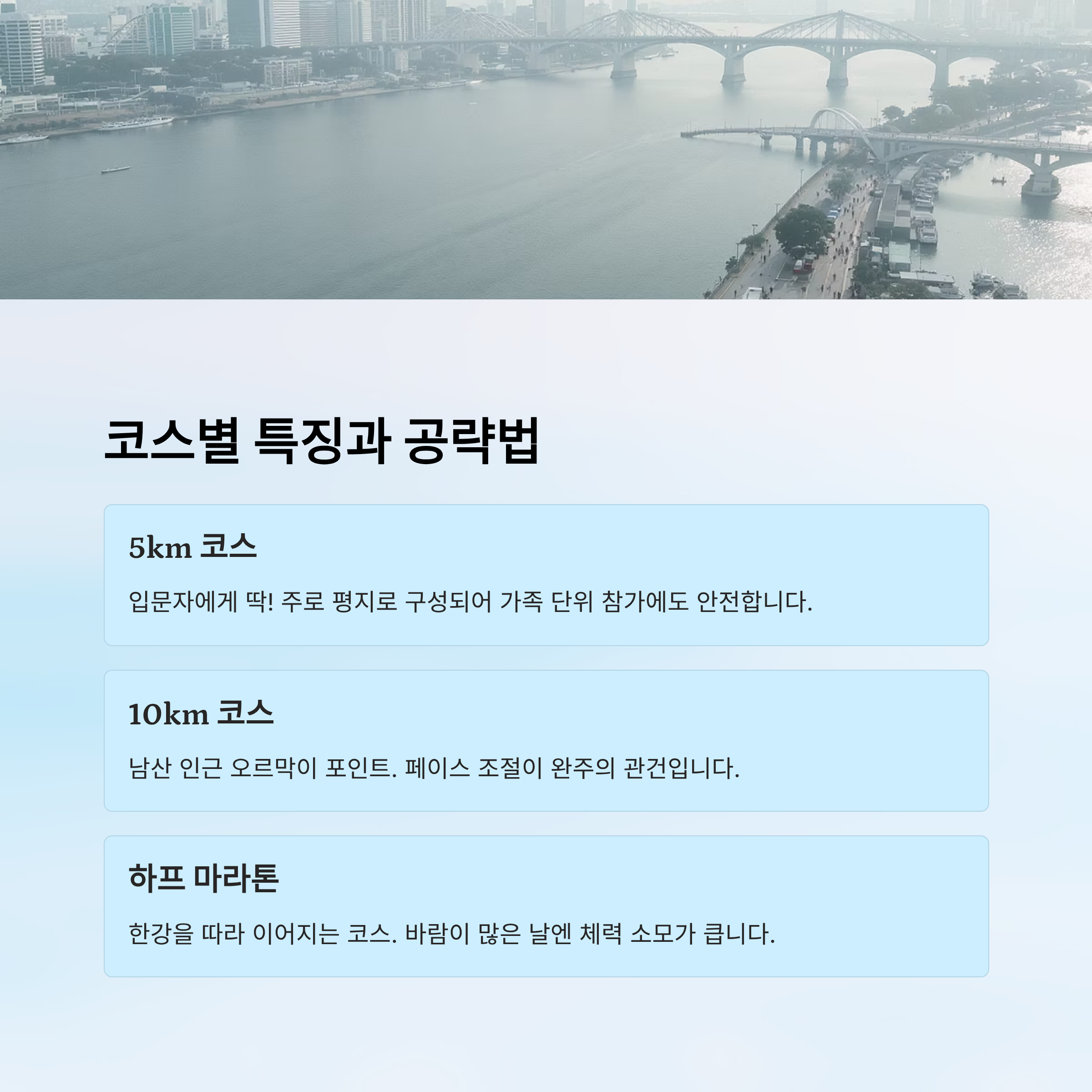| 한강 북단 | 7~16km | 바람, 탁 트인 시야 | 리듬 유지, 수분 섭취 |