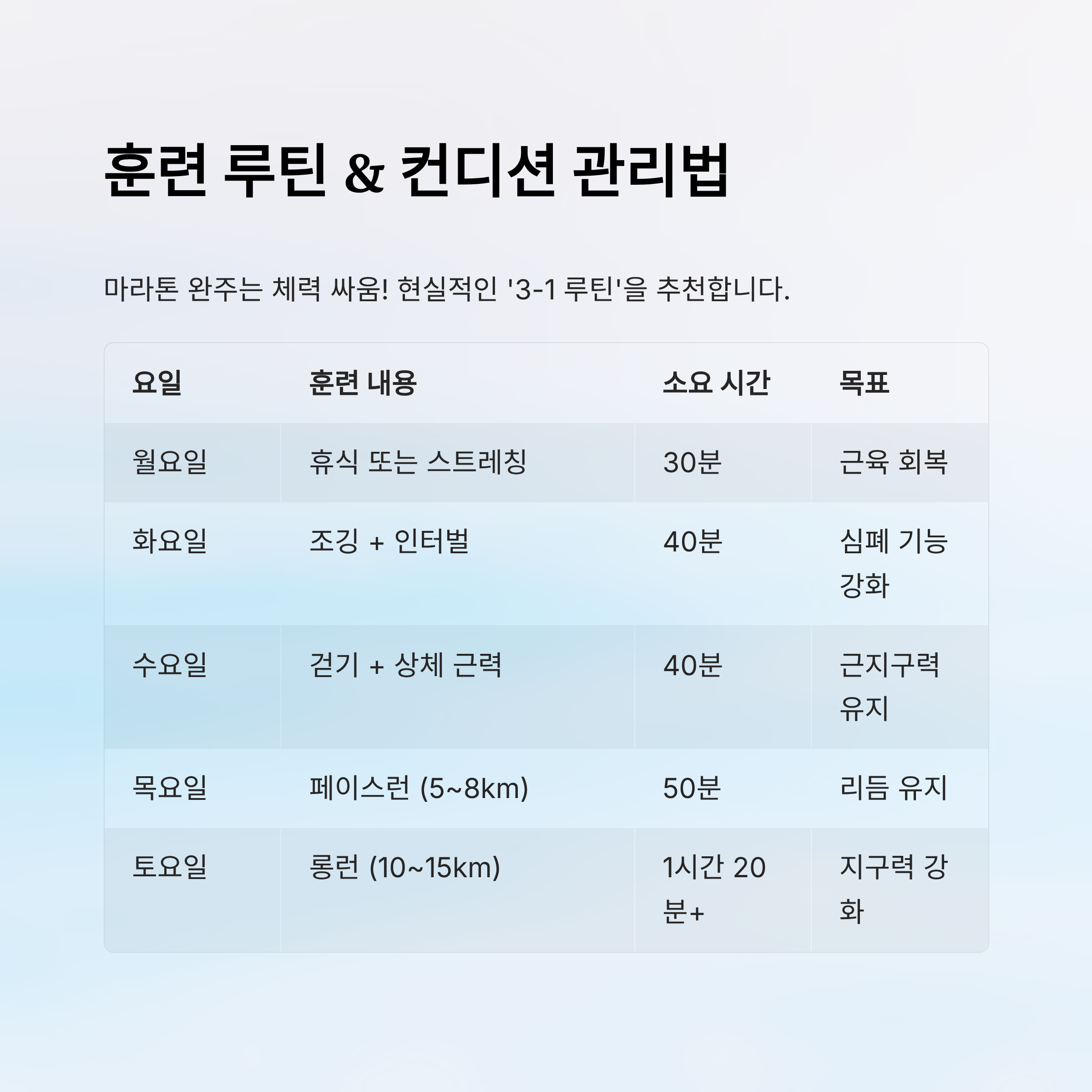 마라톤 완주는 체력 싸움이에요. 그런데 단순히 많이 달린다고 되는 건 아니에요. 제대로 된 루틴과 회복 전략을 병행해야 해요. 특히 평일엔 출퇴근, 주말엔 약속이 많아서 훈련 시간이 부족한 분들도 많잖아요. 그래서 현실적인 훈련 계획이 중요해요! 🗓️