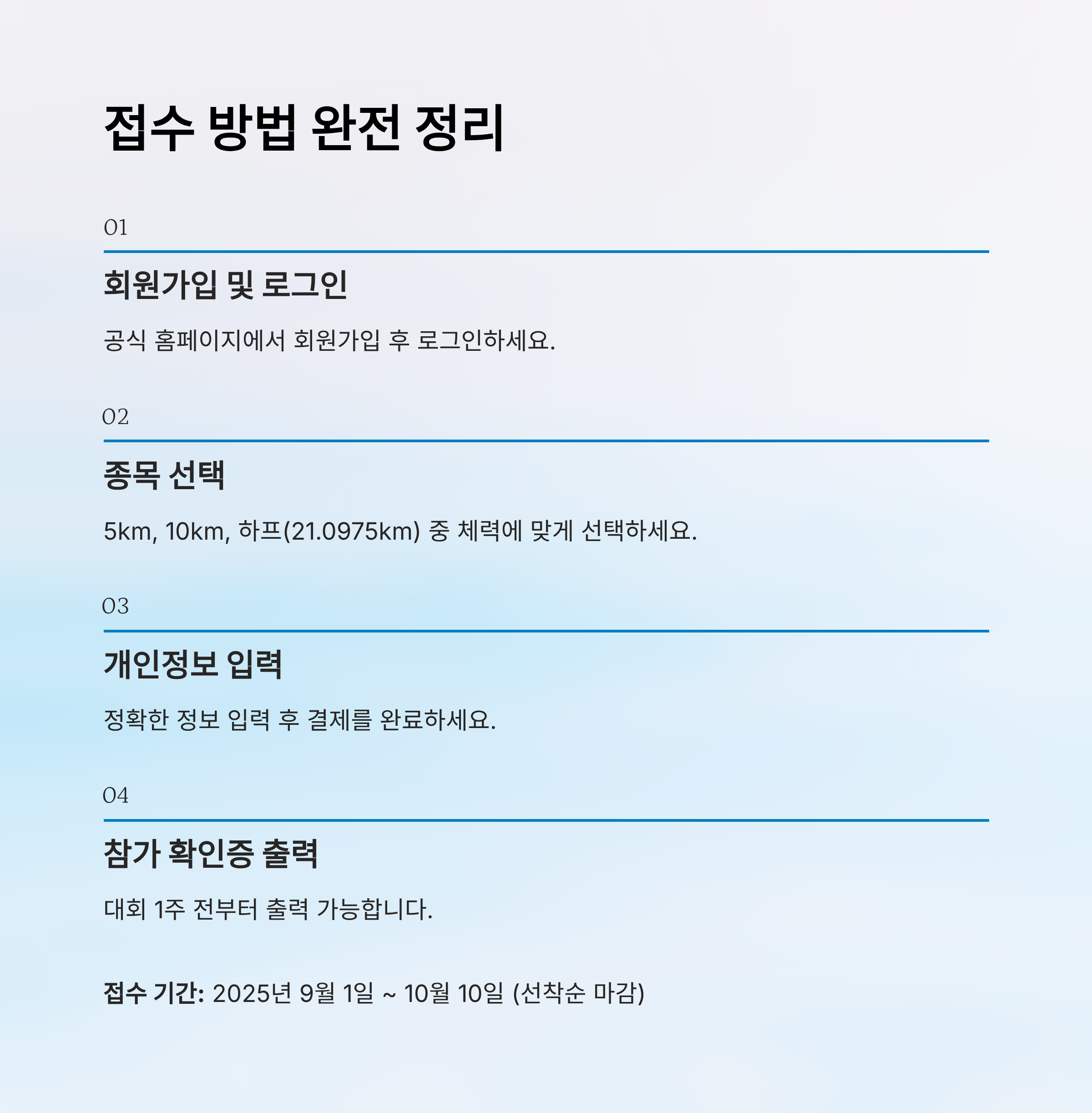 접수는 공식 홈페이지에서 온라인으로만 가능해요. 2025년 9월 1일부터 10월 10일까지, 선착순 마감이니 서두르는 게 좋아요. 참가 종목은 5km, 10km, 하프(21.0975km) 3가지가 준비돼 있어서 자신의 체력에 맞춰 선택하면 된답니다.