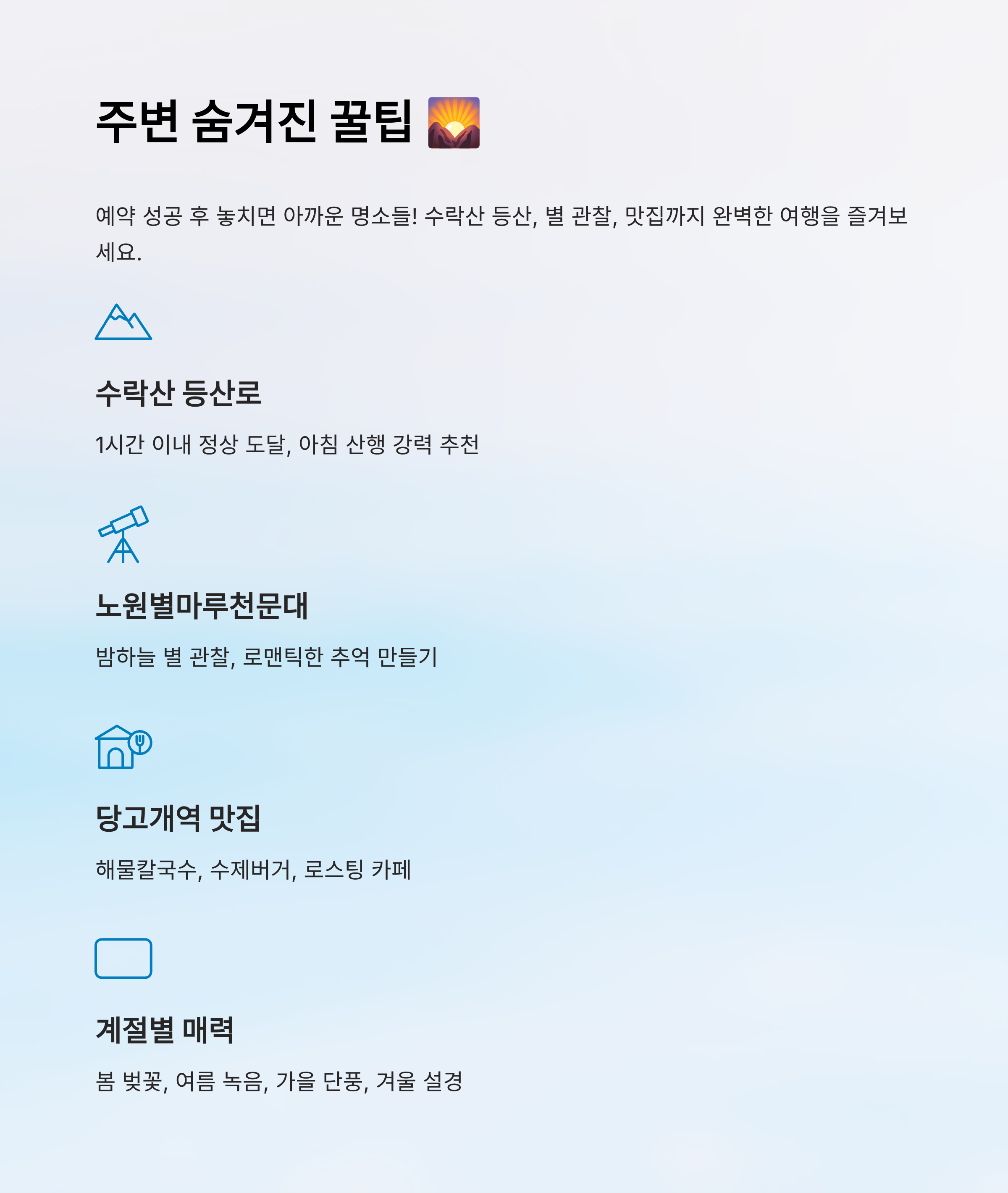 예약만 성공하면 끝이 아니에요. 수락휴 트리하우스 주변에는 놓치면 아까운 명소들이 가득해요! 먼저, 수락산 등산로 입구에서 출발하면 1시간 이내로 정상까지 오를 수 있어요. 트리하우스에서 아침 산행은 정말 강력 추천이에요. 공기부터 달라요.