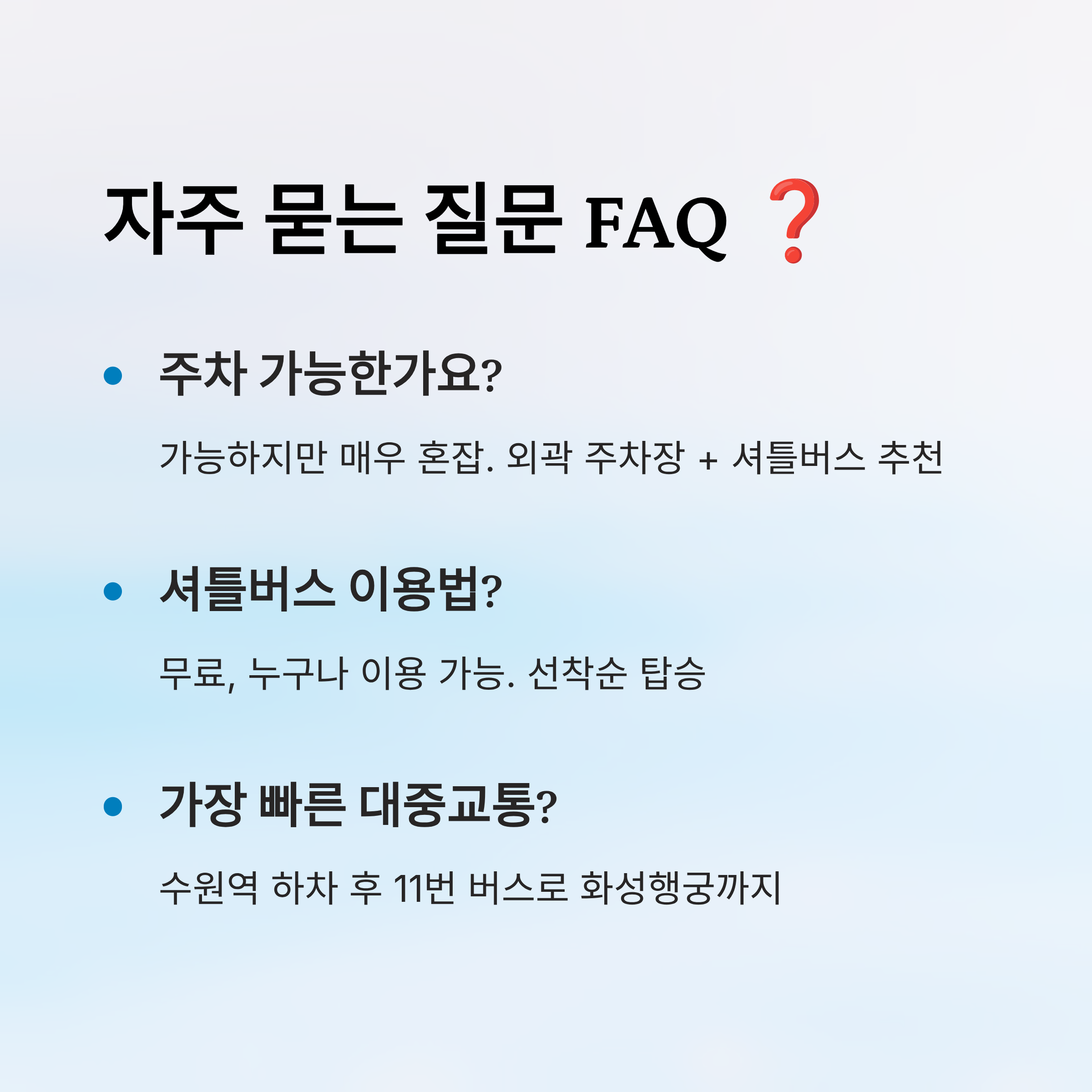 자가용을 꼭 이용해야 한다면 추천하는 방법은 ‘외곽 주차 + 셔틀버스 이용’이에요. 수원종합운동장, 아주대 근처, 수원시청 근처 공영주차장 등 비교적 한산한 지역에 주차하고, 축제 셔틀을 이용하면 훨씬 편하게 행사장까지 올 수 있어요.