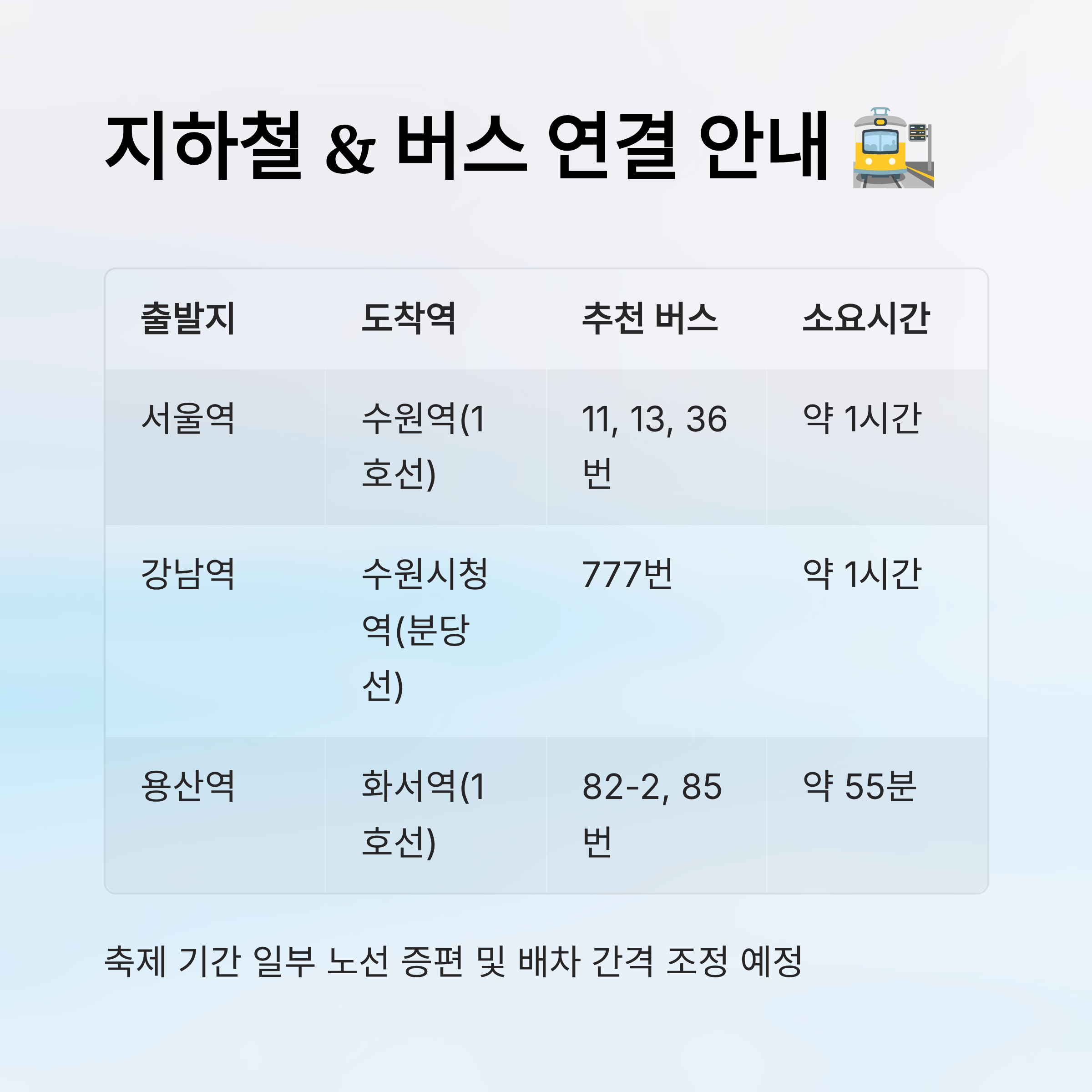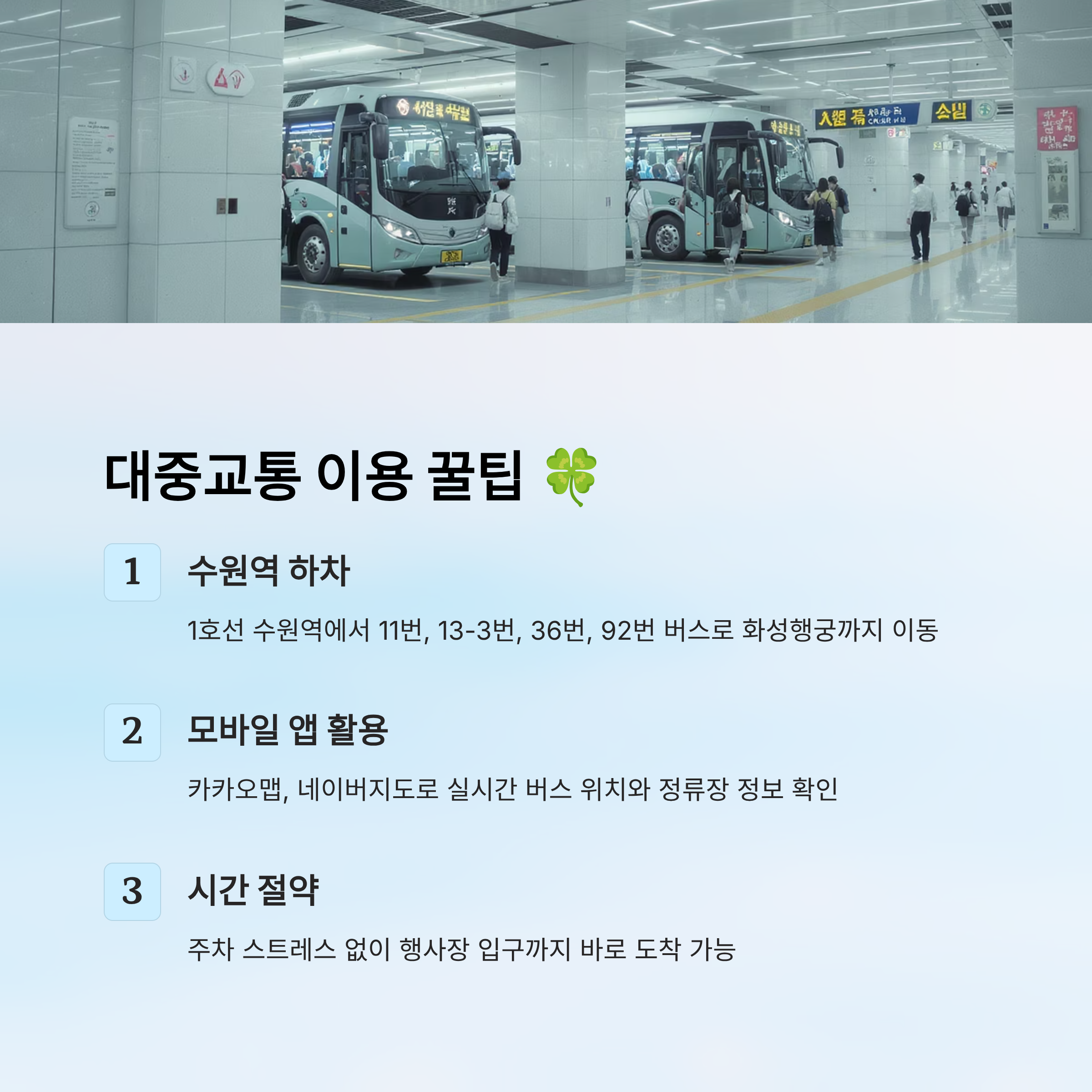 도보 이동이 힘든 어르신이나 유아 동반 가족이라면, 지하철 출구 가까운 정류장과 완만한 경사로가 연결된 노선을 선택하는 게 좋아요. 특히 수원역은 엘리베이터가 잘 되어 있어서 편하답니다.