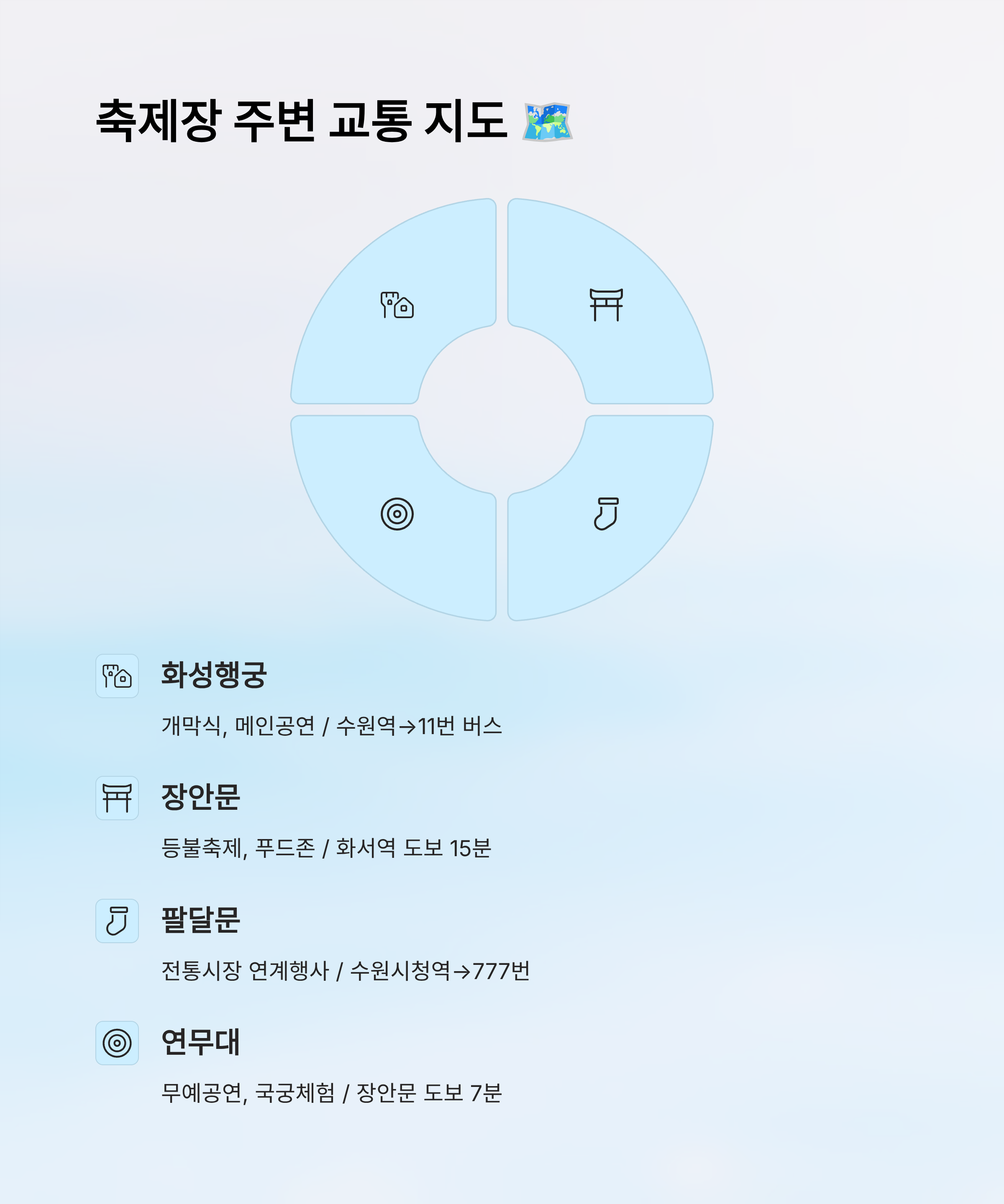 📌 본 글은 2025년 9월 기준 수원화성문화제 공식 자료 및 수원시 교통정보를 바탕으로 작성되었으며, 일정 및 운영 방식은 축제 측 사정에 따라 변경될 수 있습니다. 방문 전 반드시 공식 홈페이지 및 교통 공지사항을 재확인하시길 바랍니다.