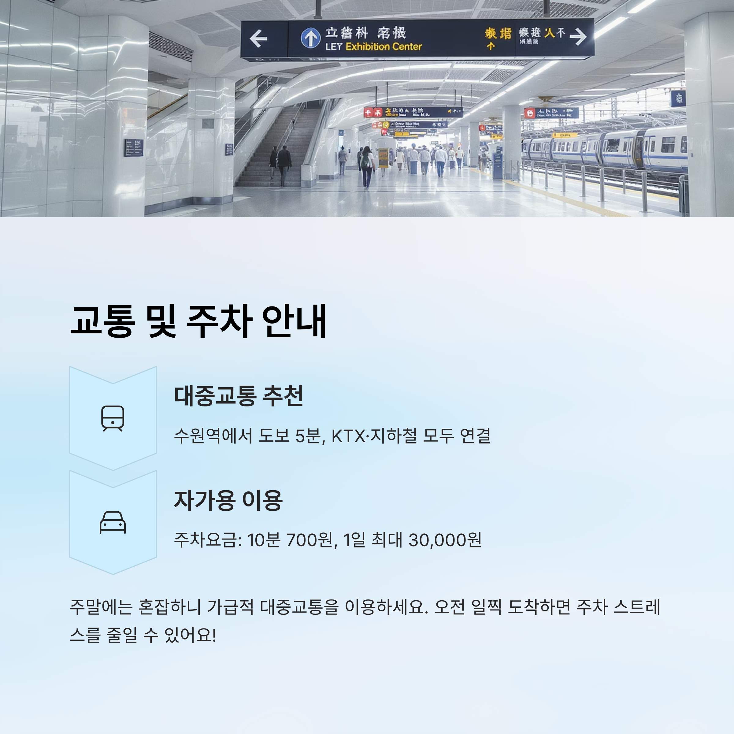 자가용을 이용하는 경우에는 주차 공간을 확인해 두는 게 좋아요. 수원메쎄 주차장은 기본 10분에 700원, 1일 최대 30,000원으로 운영돼요. 전시회 기간 동안 많은 차량이 몰리기 때문에 행사 시작 전 이른 시간에 도착하는 게 주차 스트레스를 줄이는 방법이에요. 특히 주말은 혼잡하니, 가급적 대중교통 이용을 권장하고 있어요.