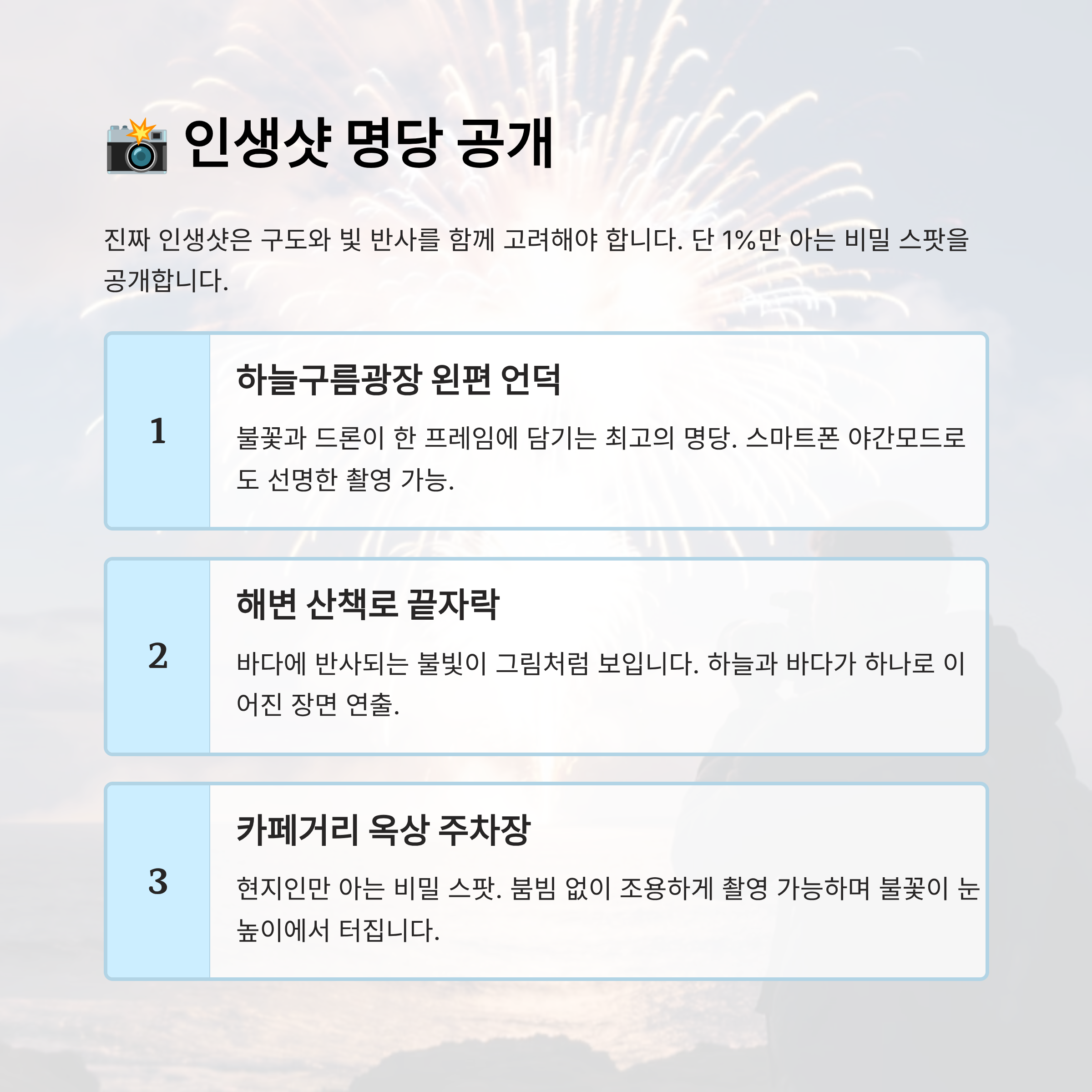 세 번째 추천 장소는 씨사이드 카페거리 뒤쪽 주차장 옥상이에요. 이곳은 인근 주민들만 아는 비밀 스팟인데, 사람 붐빔 없이 조용하게 촬영할 수 있어요. 불꽃이 눈높이에서 터지는 느낌이라 영상용으로도 좋아요. 📹