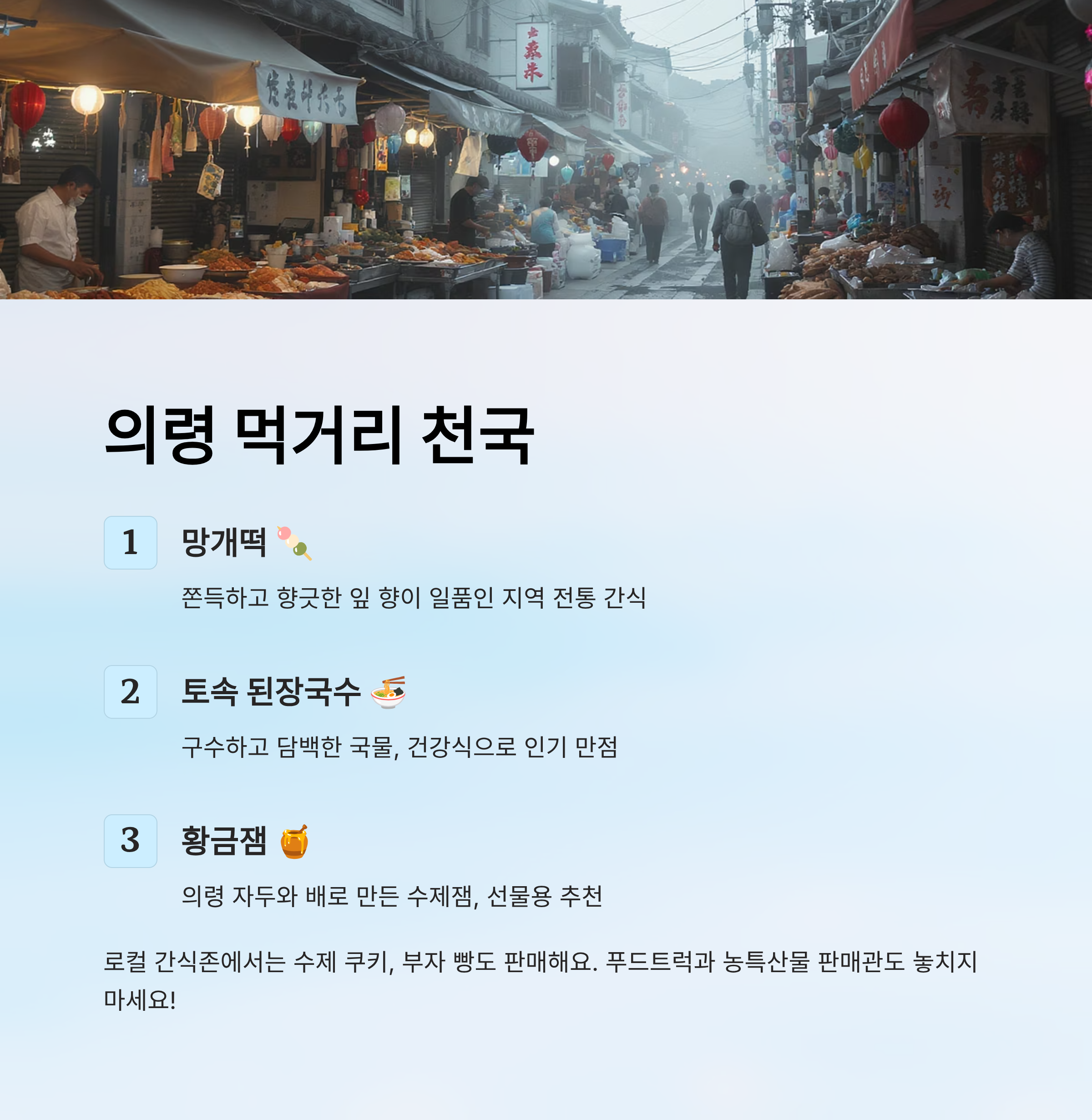 의령 리치리치 페스티벌의 진짜 매력 중 하나는 바로 먹거리예요! 축제장을 돌다 보면 출출할 틈도 없이 맛있는 냄새가 코끝을 자극해요. 😋 지역 특산물부터 푸드트럭 간식까지, 배불리 즐길 수 있는 먹거리 천국이랍니다.