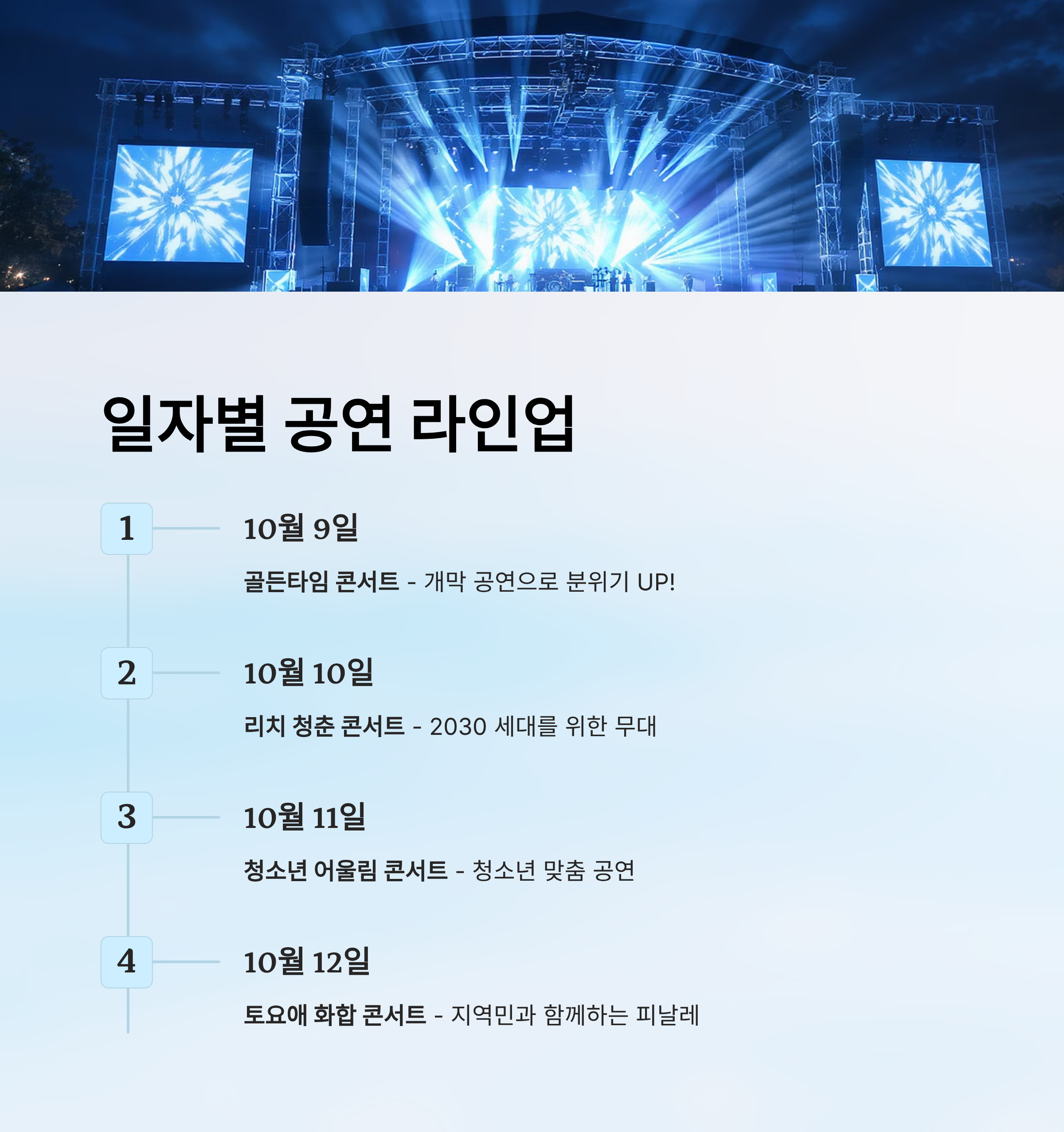 우선 개막일인 10월 9일에는 ‘골든타임 콘서트’가 열리며 분위기를 제대로 띄워줘요. 이후 10일엔 ‘리치 청춘 콘서트’, 11일엔 청소년을 위한 ‘청소년 어울림 콘서트’, 12일엔 ‘토요애 화합 콘서트’로 마무리를 장식해요. 연령대별로 맞춤 공연이 진행돼서 가족 단위 방문객도 다 만족할 수 있어요.