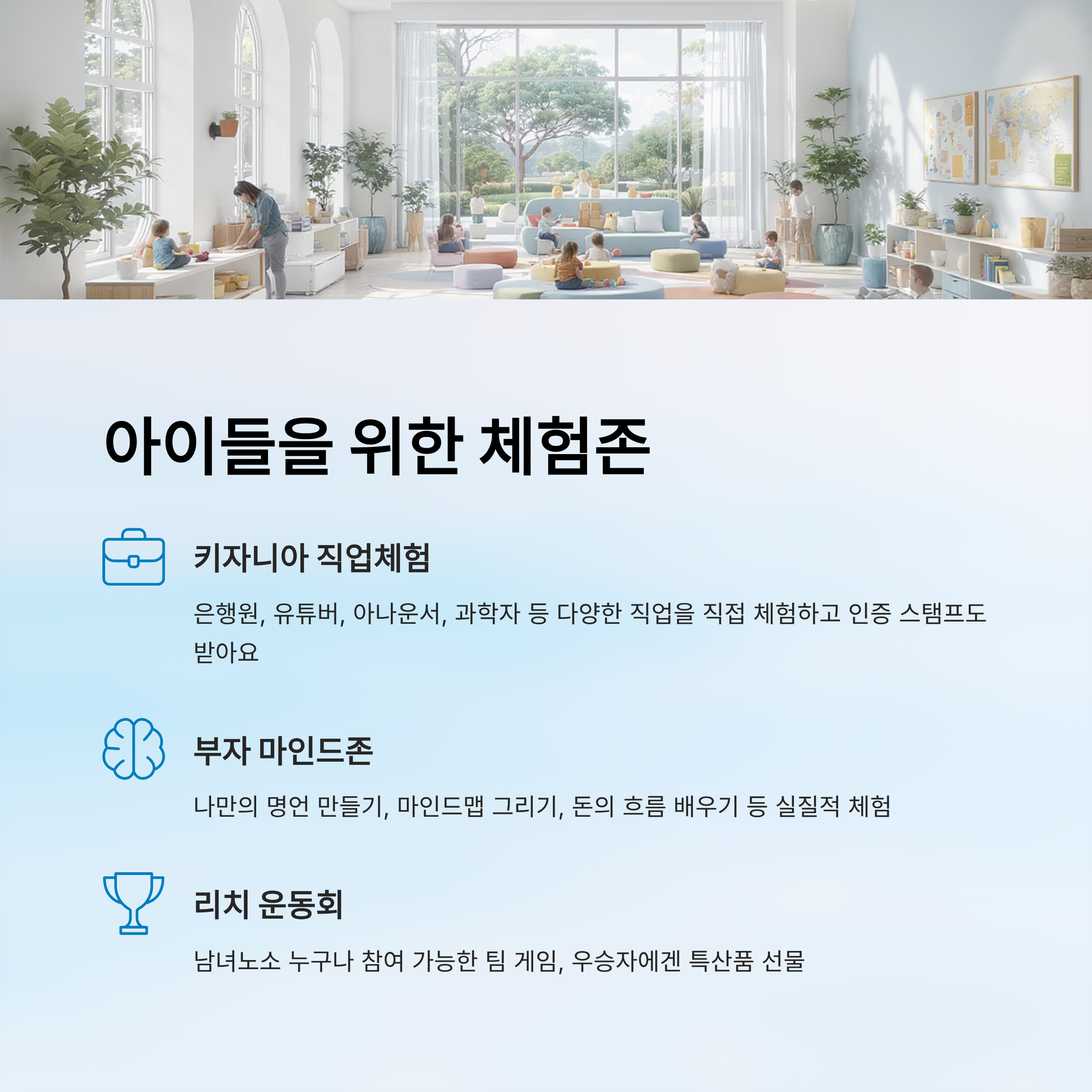 아이들은 여기서 은행원, 유튜버, 아나운서, 과학자 등 다양한 직업을 체험해볼 수 있고, 체험 후에는 인증 스탬프를 받아 작은 선물도 받을 수 있어요. 어른들도 ‘부자 마인드 체험존’에서 자신만의 습관을 점검해볼 수 있어서 의외로 인기 만점이에요.