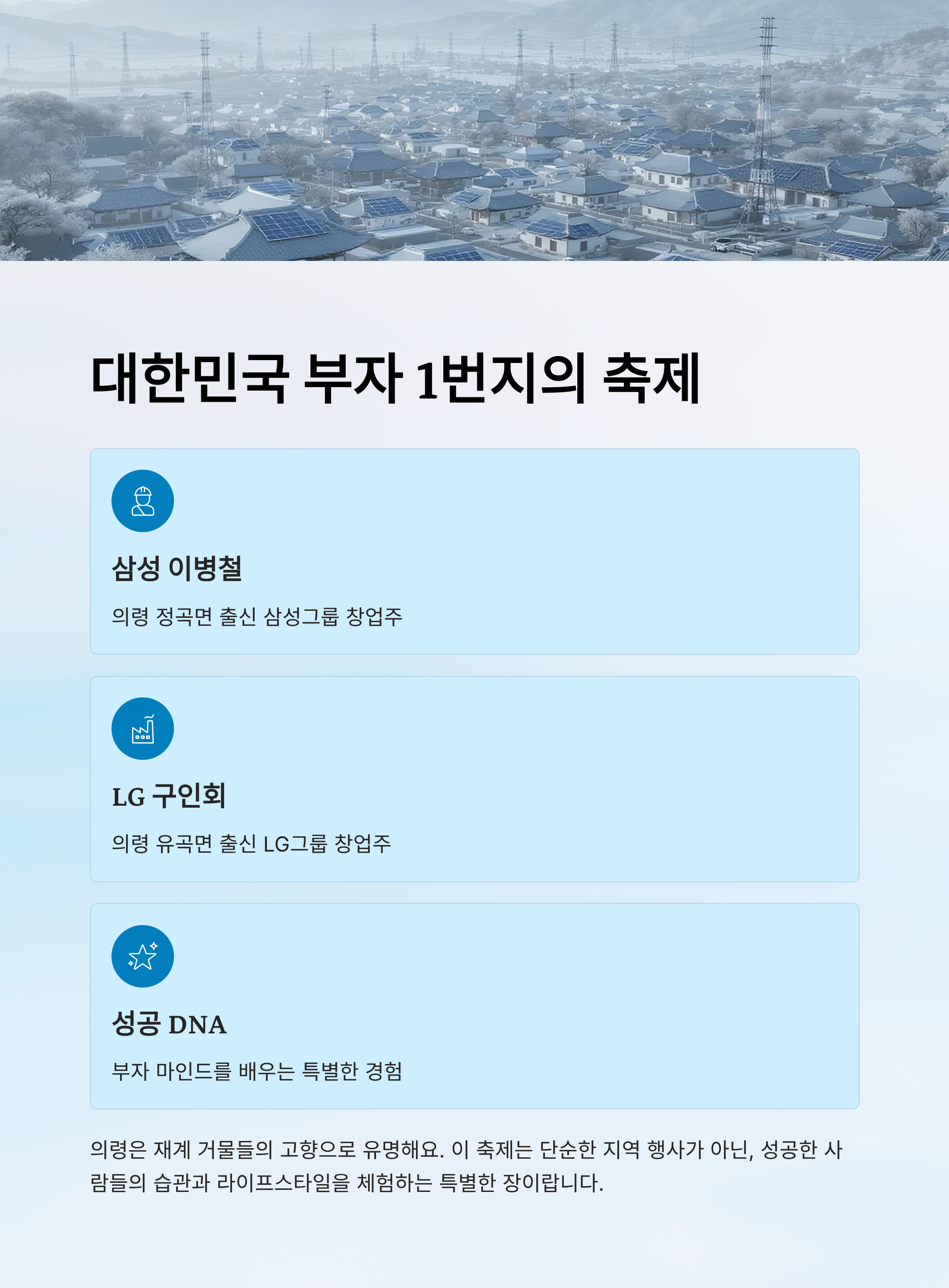 의령은 실제로 재계 거물들의 고향으로 잘 알려져 있어요. 삼성 창업주 이병철 회장, LG 구인회 회장 등이 바로 이곳 의령 출신이랍니다. 그만큼 이 지역은 ‘성공 DNA’를 가진 곳이라고 해도 과언이 아니에요.
