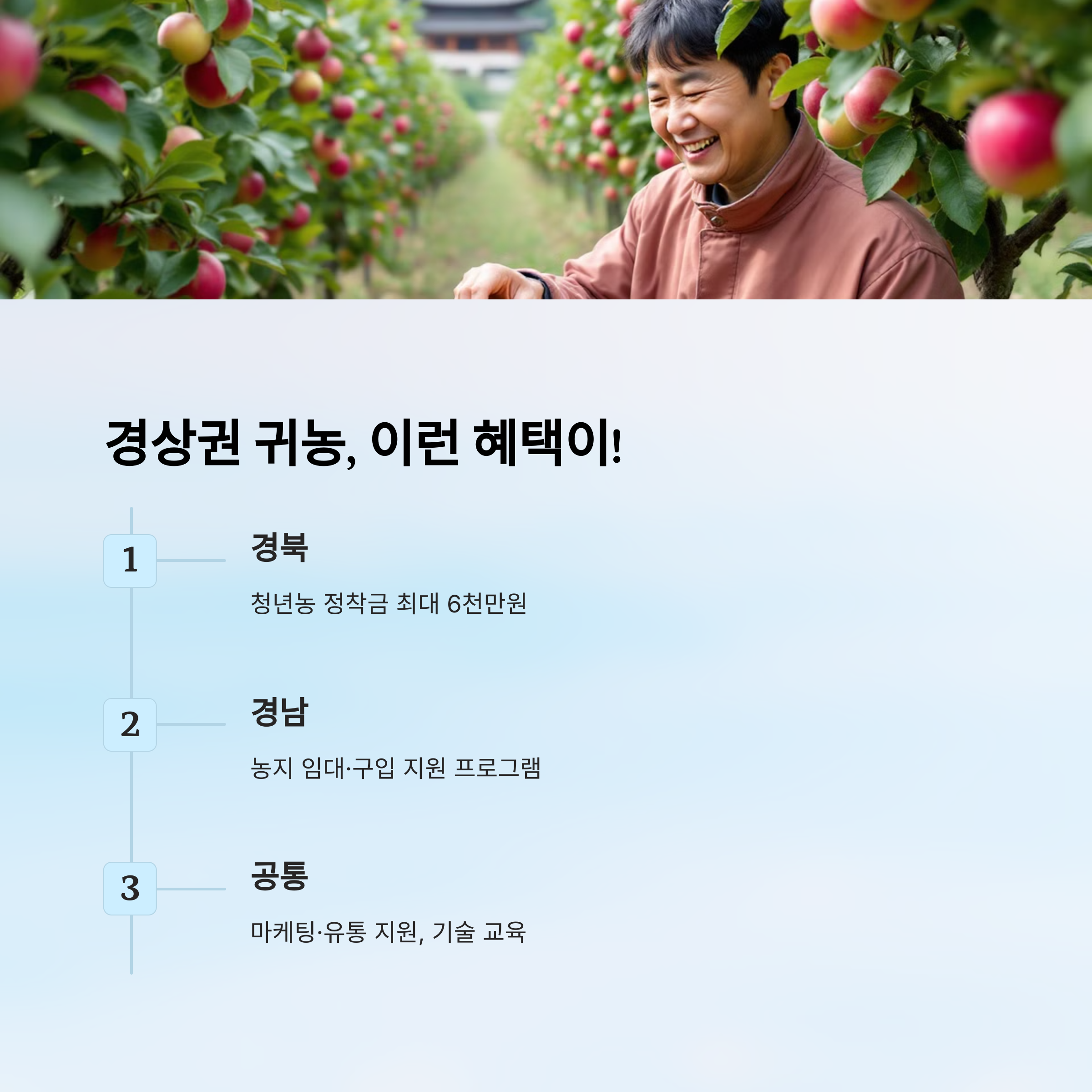 경상권은 특히 **영농 기반 조성 자금과 작목별 기술지원**이 강한 편이에요. 실제로 농사에 바로 뛰어들 수 있도록 장비 대여, 컨설팅, 선배 농가 매칭 프로그램도 운영되고 있어요. 귀농 실전형 패키지라 볼 수 있죠!
