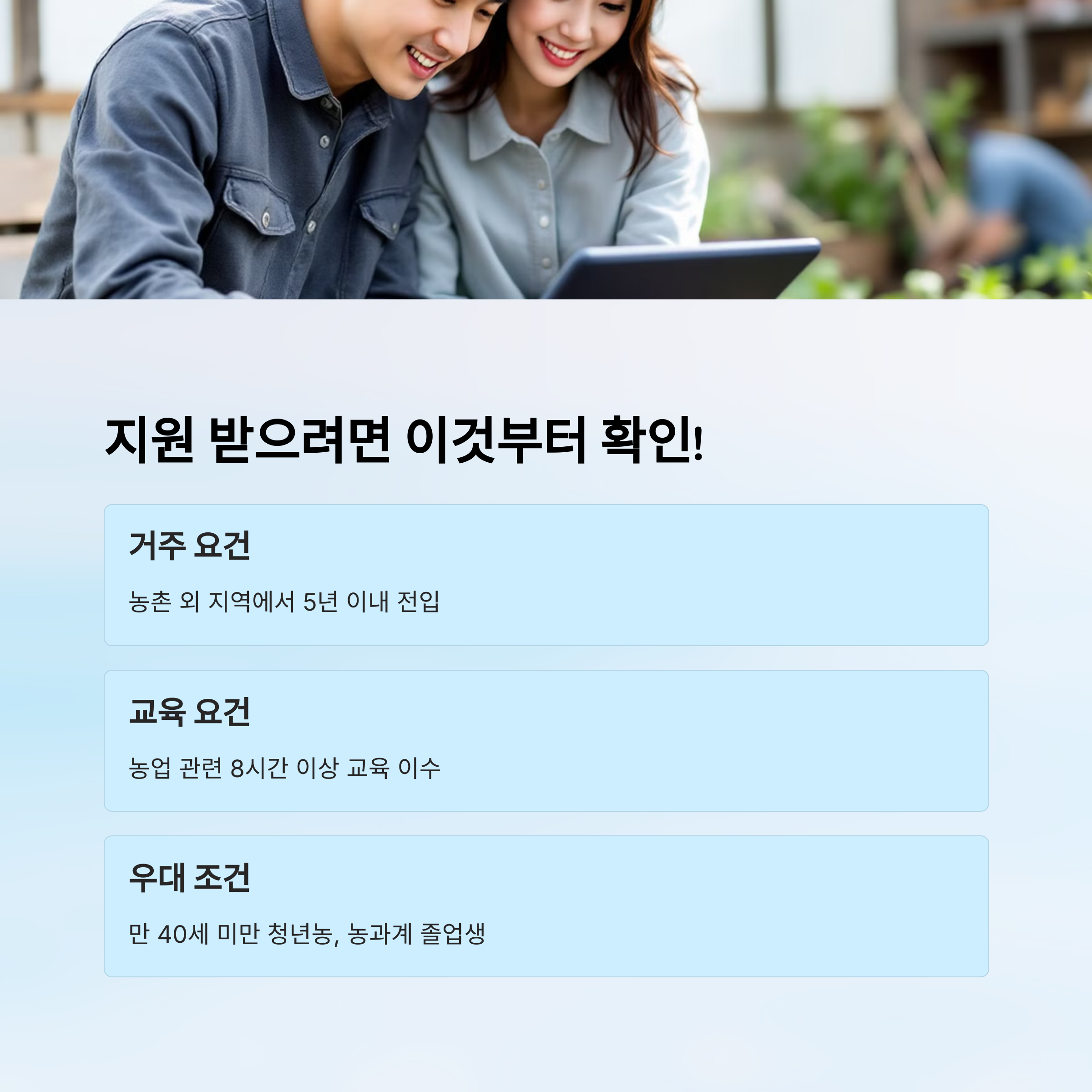 그리고 **‘귀농 교육 이수’도 필수 조건**이에요. 대부분의 지자체는 최소 100시간의 귀농귀촌교육을 요구하고, 일부는 영농창업교육까지 포함하기도 해요. 한국농어촌공사, 농업기술센터 등을 통해 이수 가능해요.