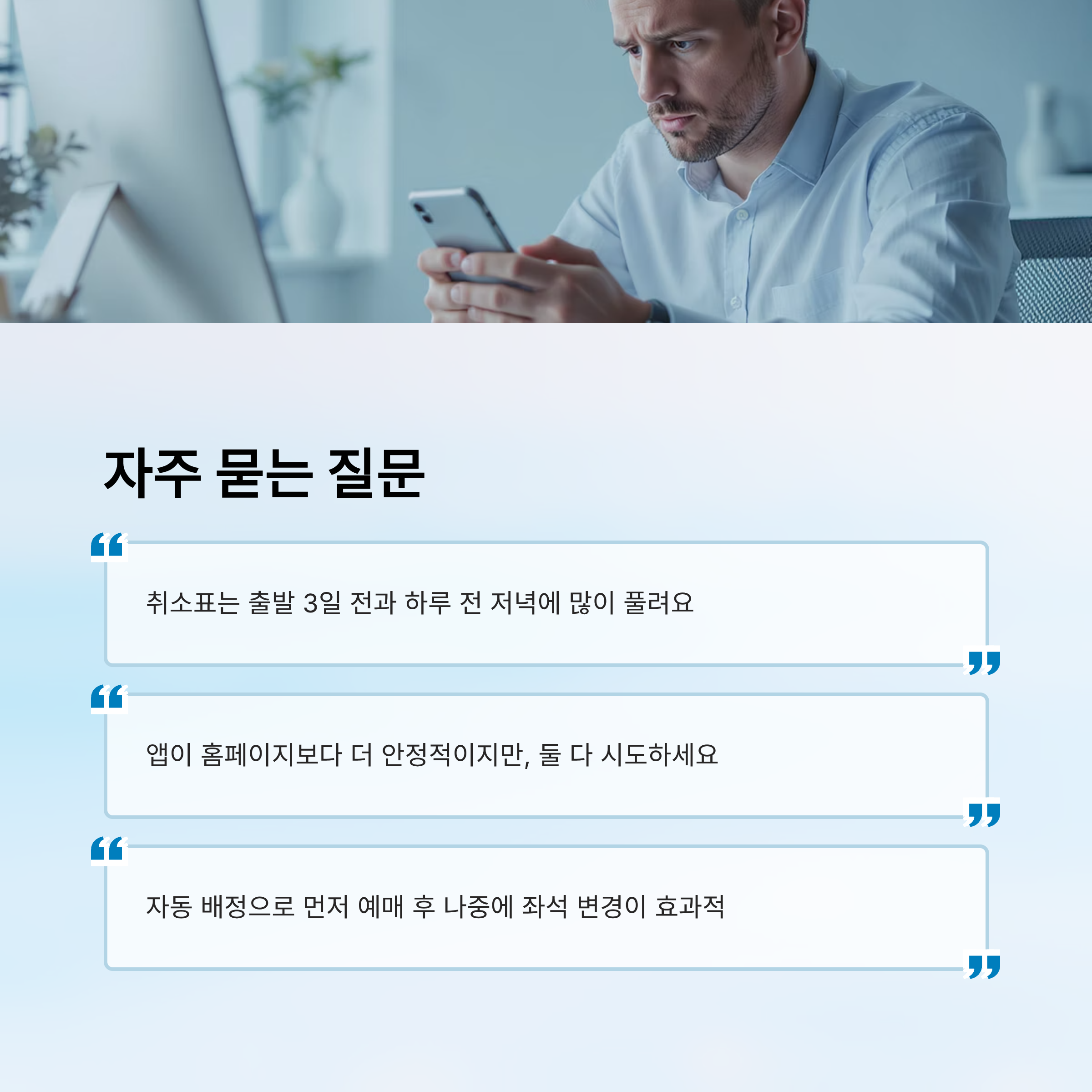둘째, 좌석 선택 방식이에요. 원하는 특정 좌석을 고르기보다는 자동 배정을 누르는 게 훨씬 빨라요. 창가나 복도 자리 같은 욕심을 내려놓고 일단 티켓을 확보한 뒤 필요하다면 나중에 취소표로 바꾸는 게 훨씬 현명해요.