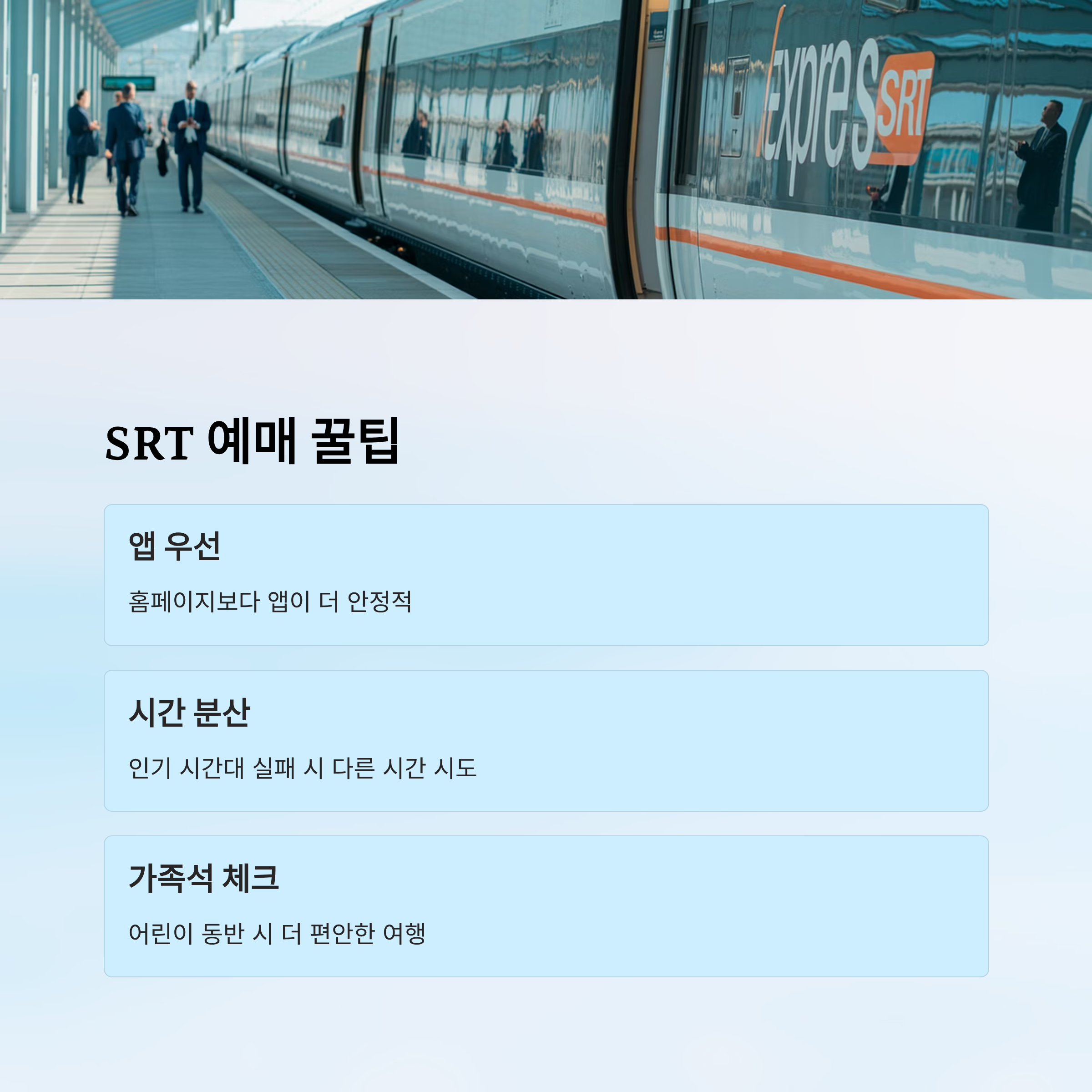 정리하면, SRT 예매의 핵심은 “앱 우선, 시간 분산 전략, 가족석 체크” 이 세 가지예요. 이 전략만 기억한다면 원하는 시간대 열차를 잡을 확률이 훨씬 높아져요. 🚄