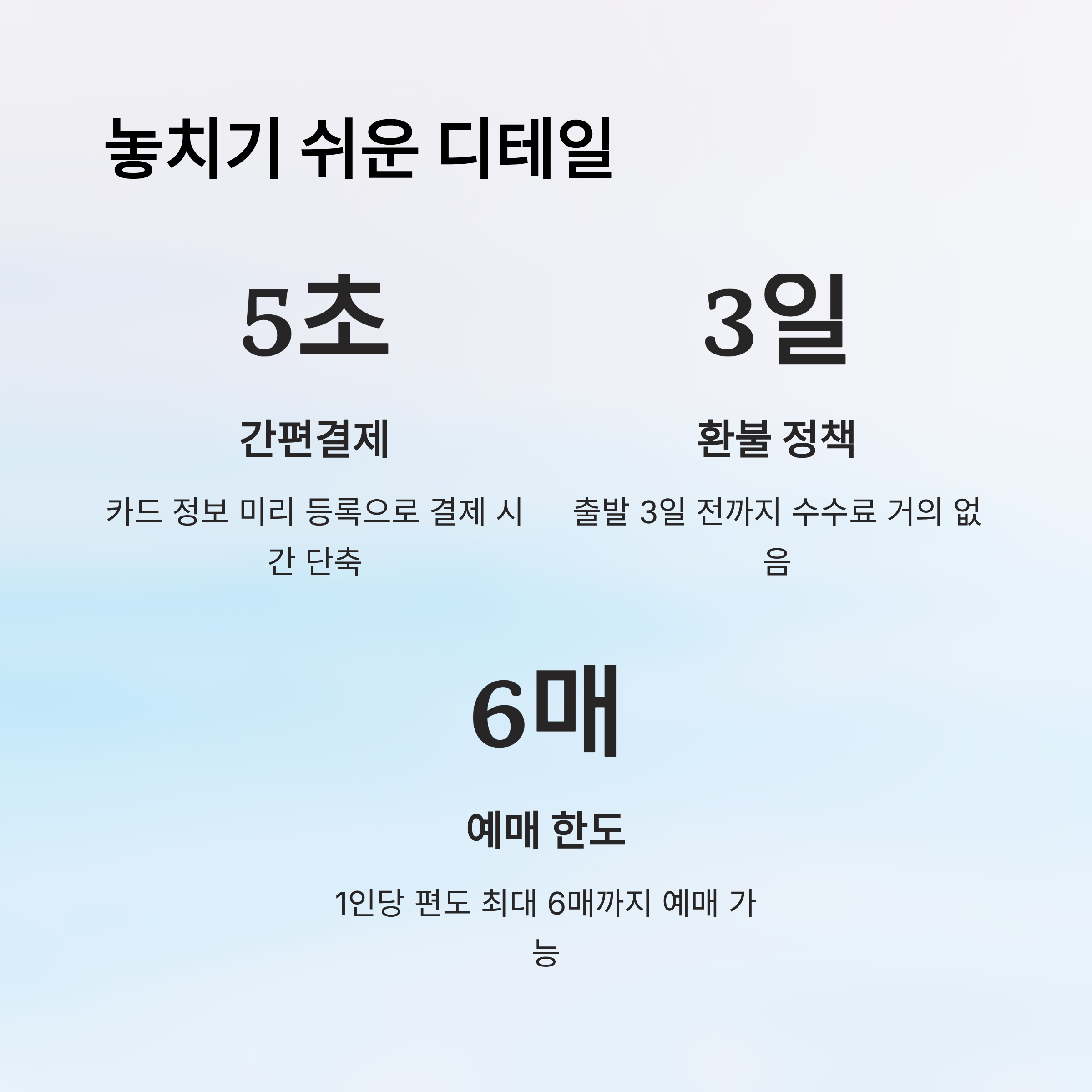 | 4단계 | 좌석 선택 | 창가/복도 구분 없이 먼저 예매 |