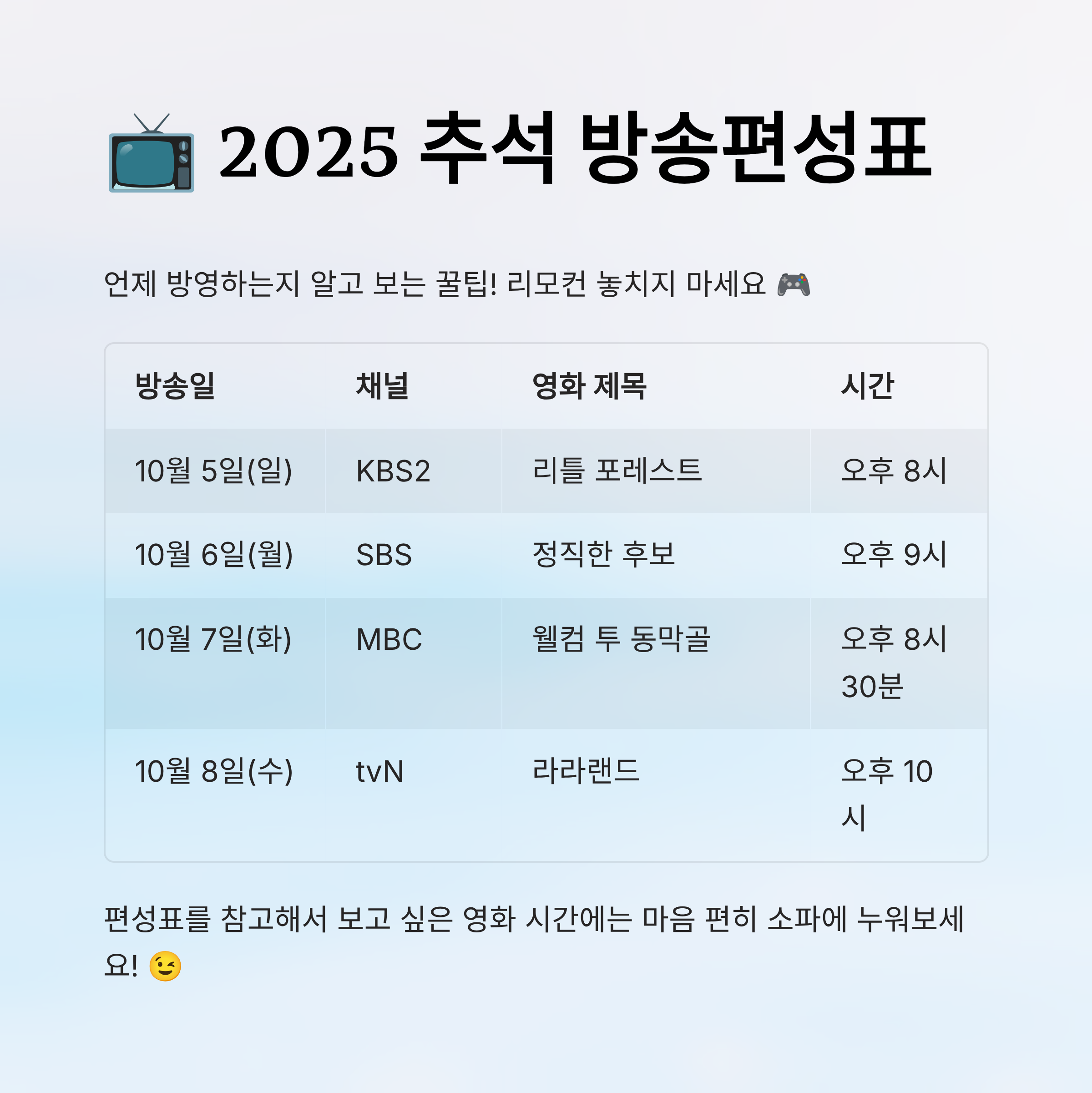 ※ 위 편성표 및 영화 정보는 2025년 10월 기준이며, 방송사 사정에 따라 변경될 수 있어요. 최신 정보는 공식 채널을 통해 확인해주세요.