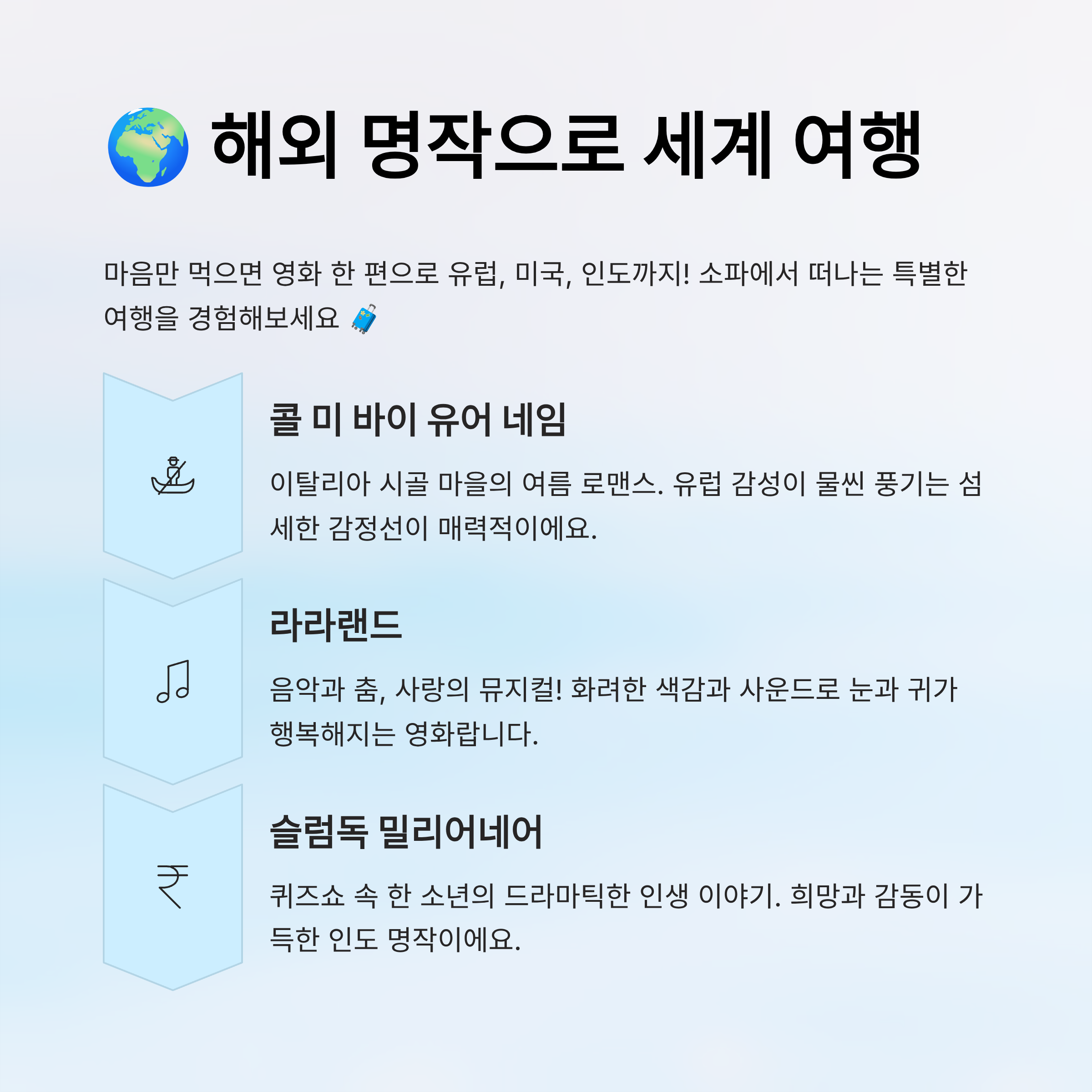 명절에 꼭 고향만 가야 하나요? 마음만 먹으면 영화 한 편으로도 유럽, 미국, 일본, 인도로 여행 갈 수 있어요. 🧳 이번 추석엔 해외 명작들로 세계 한 바퀴 돌아보는 기분을 느껴보세요.