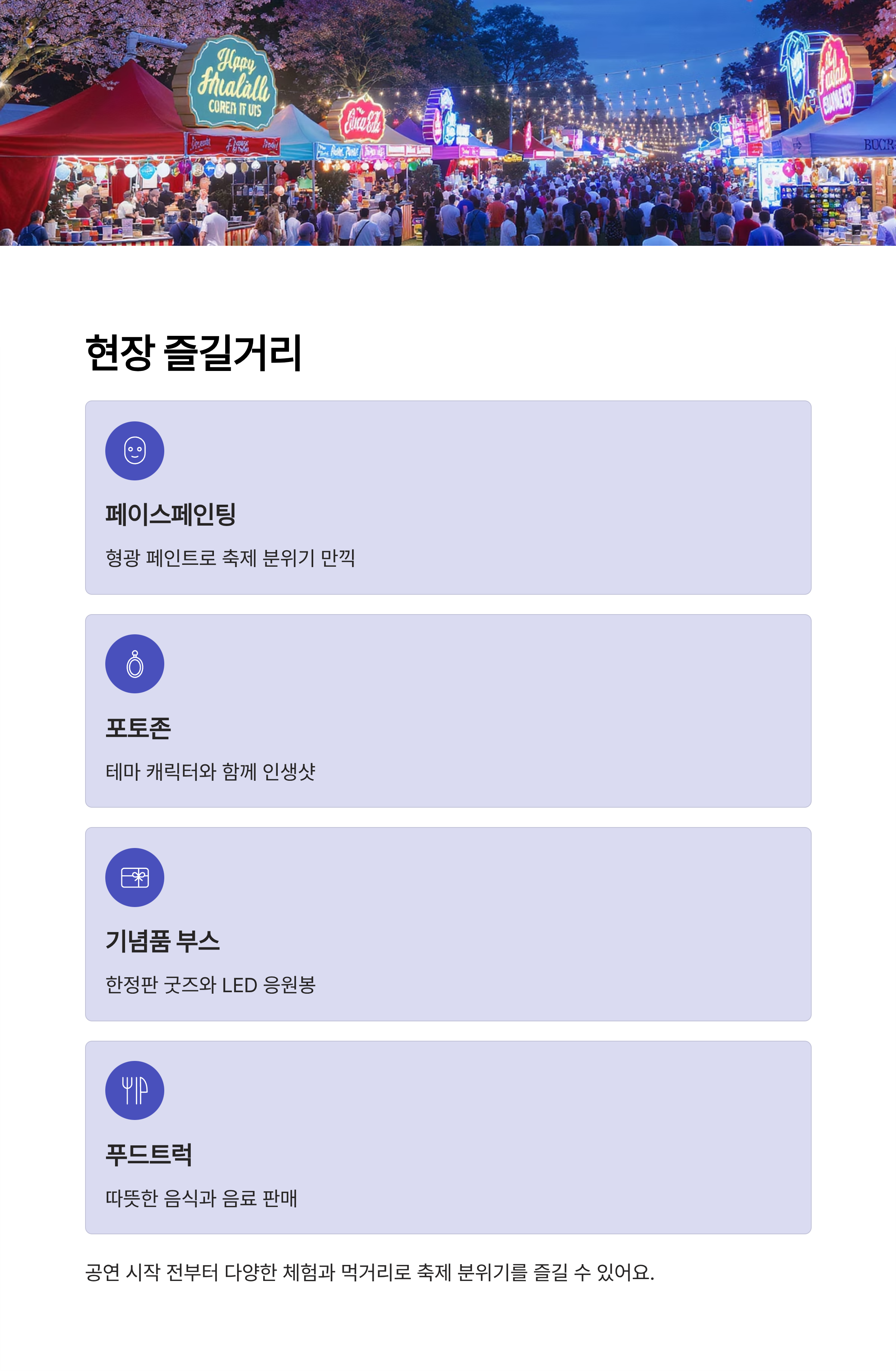 A8. 네, 푸드트럭과 간식 부스가 운영돼요. 따뜻한 음식과 음료를 현장에서 구매할 수 있어서 공연을 기다리는 동안 편하게 즐길 수 있어요.