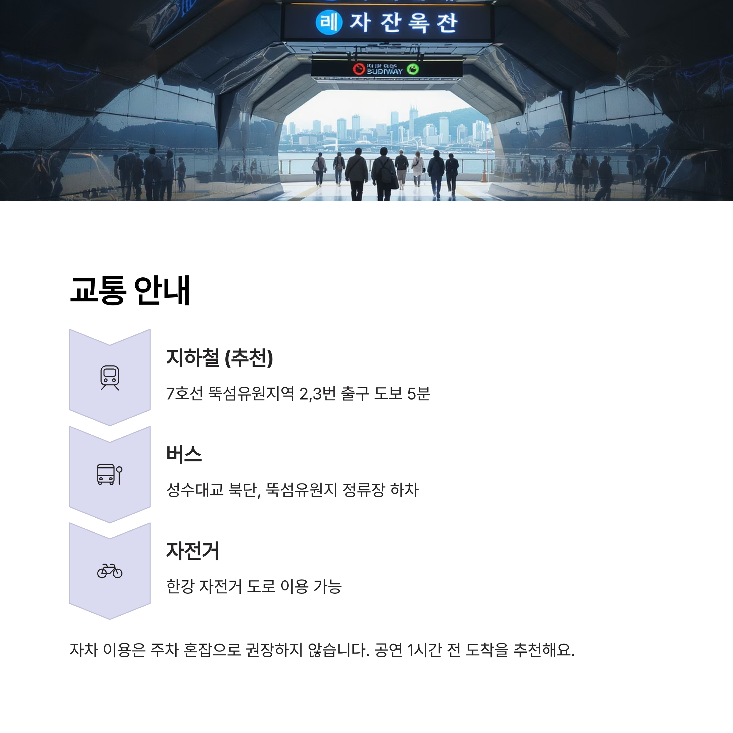 버스를 이용하는 방법도 있어요. 성수대교 북단 정류장, 뚝섬유원지 정류장에 하차하면 도보로 이동이 가능해요. 특히 강동, 강남, 성동구 쪽에서 접근하는 관람객이라면 버스 노선을 확인해 두는 게 좋아요. 다만 공연 종료 후에는 버스 탑승 대기 줄이 길어질 수 있으니 참고해야 해요.