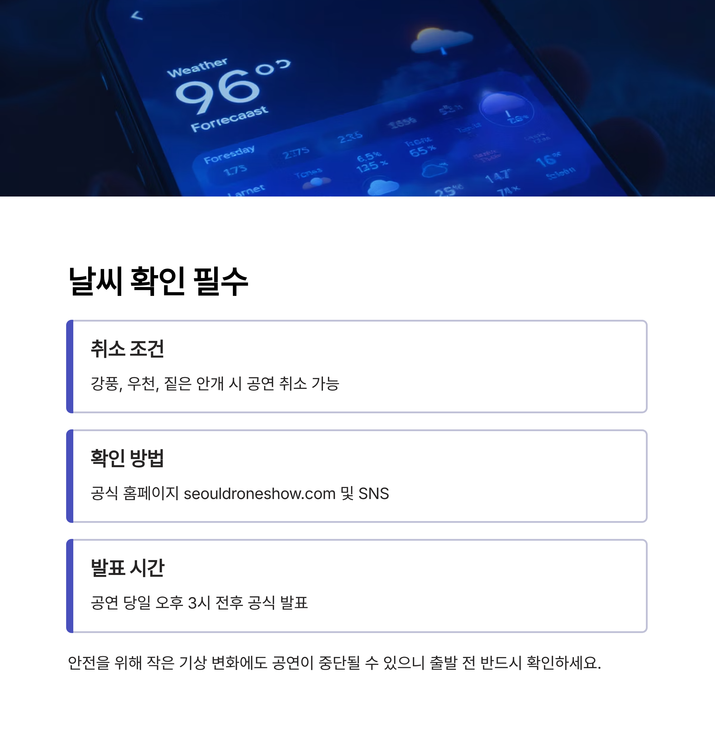 모든 공연 일정은 날씨에 따라 변경될 수 있어요. 갑작스러운 비, 강풍 등은 드론 운행에 큰 영향을 주기 때문에 공연이 연기되거나 취소될 가능성이 있어요. 따라서 당일 오후에 공식 홈페이지 seouldroneshow.com이나 SNS 공지를 확인하는 것이 필수랍니다. 이 확인 절차를 거치면 공연 당일 헛걸음을 하지 않을 수 있어요.