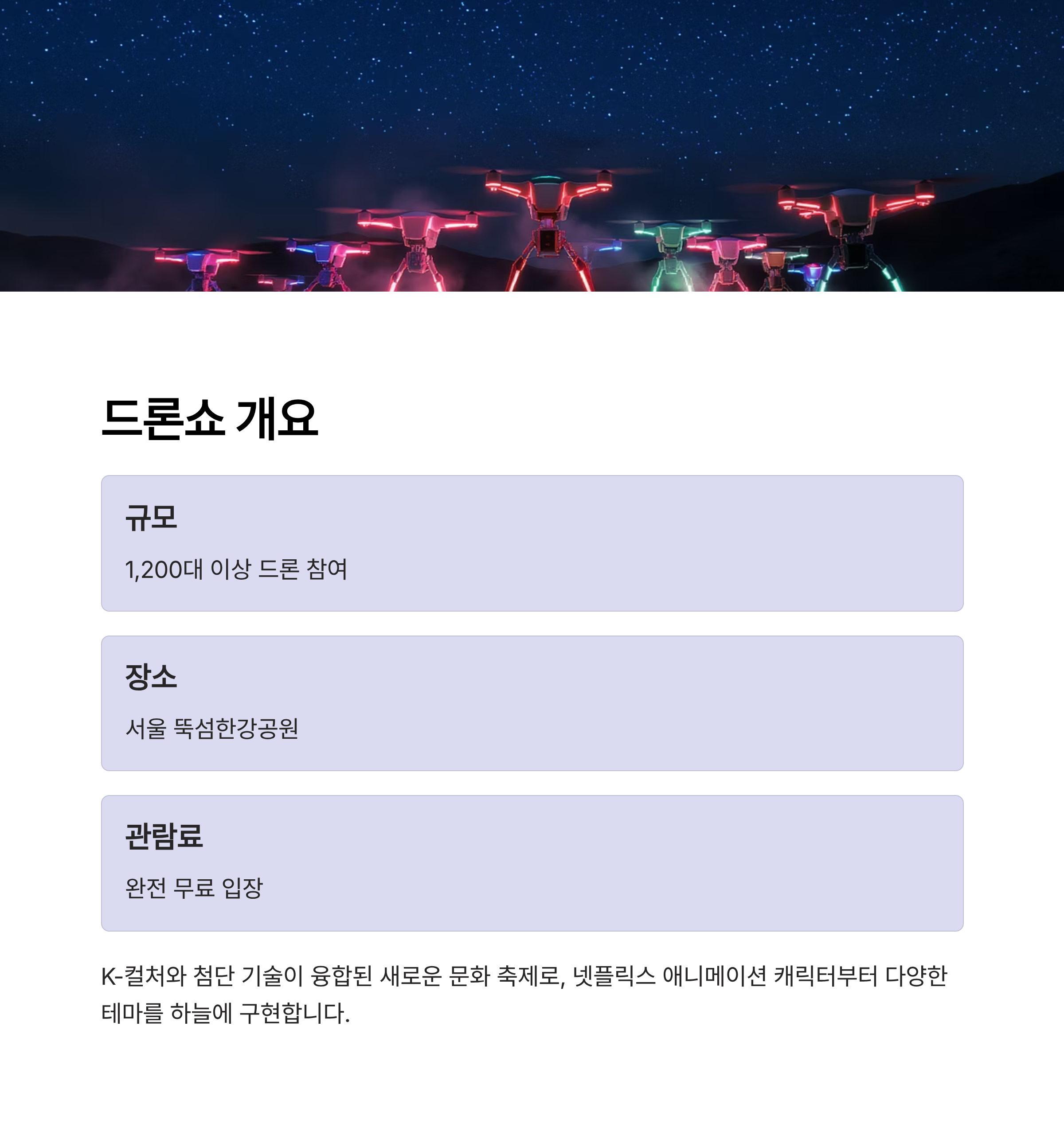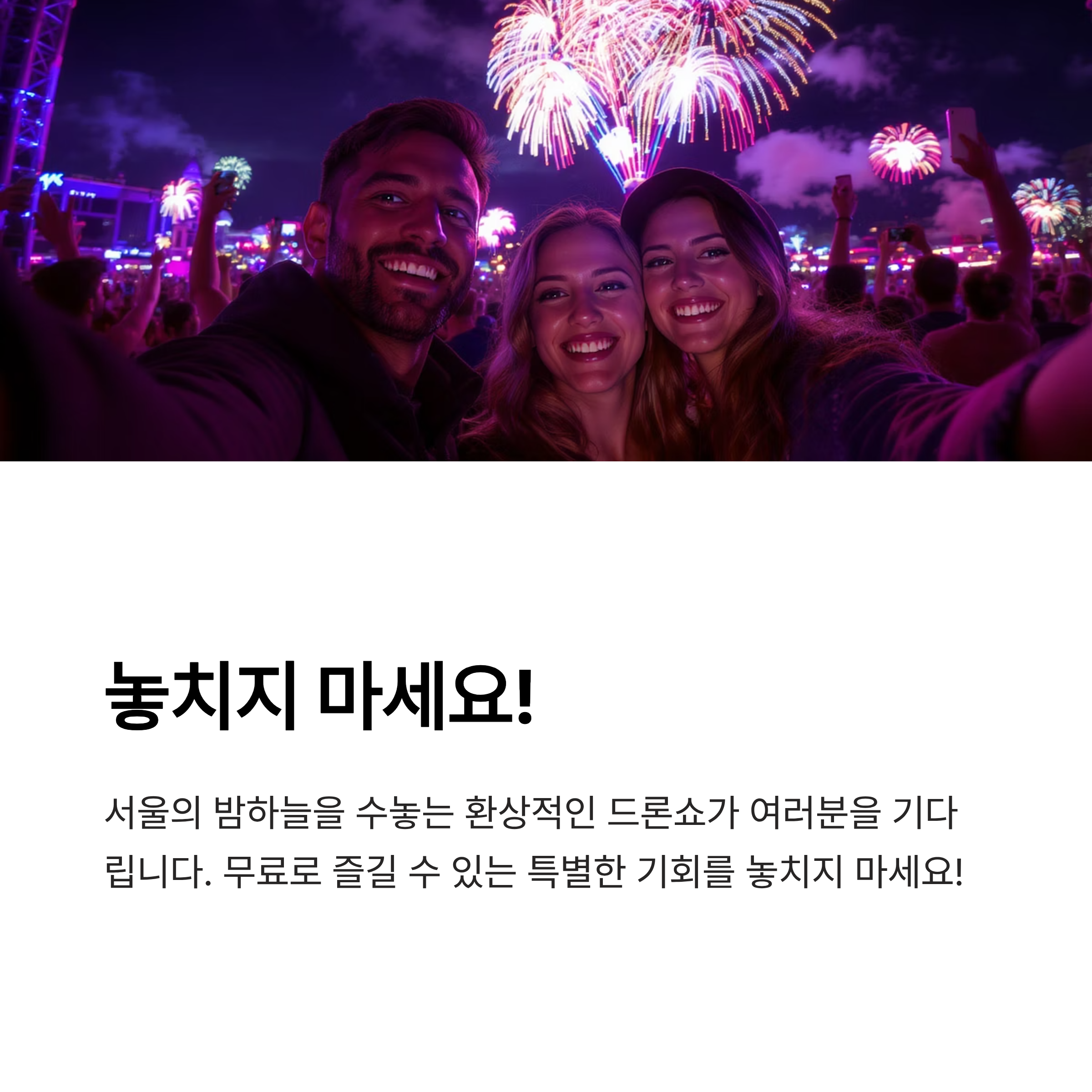 정리하면, 2025 한강 드론쇼는 기술, 문화, 예술이 어우러진 도심 속 복합 축제예요. 무료 관람과 함께 다양한 부대 프로그램이 운영되니 누구든지 가볍게 방문할 수 있고, 현장에서는 더욱 풍성한 체험을 누릴 수 있어요.