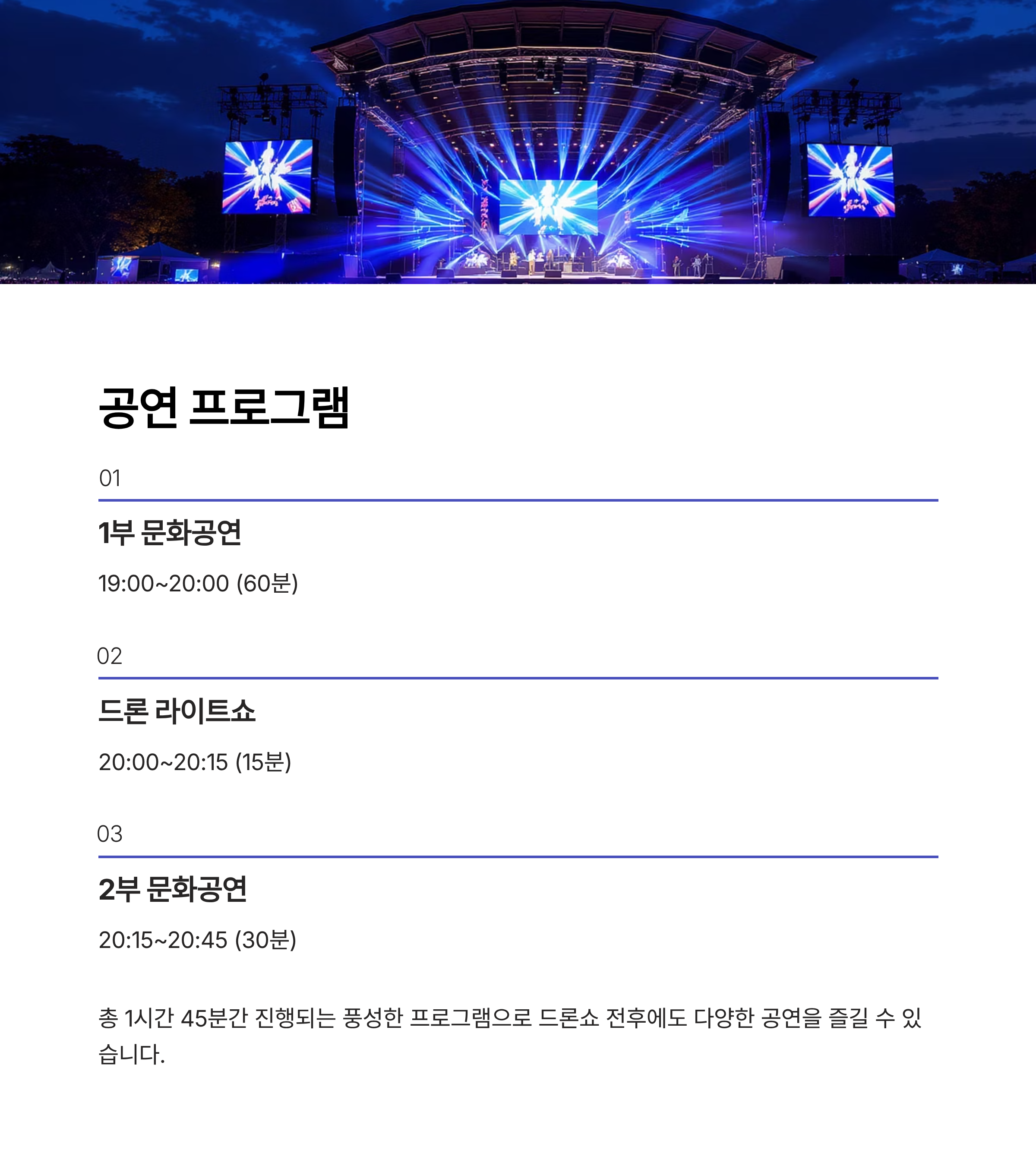 공연은 1부 문화 공연(19:00~20:00), 드론 라이트쇼(20:00~20:15), 2부 문화 공연(20:15~20:45) 순으로 진행돼요. 가족 단위 관람객을 위해 포토존, 페이스페인팅 같은 부대행사도 준비되어 있어 풍성하게 즐길 수 있죠.