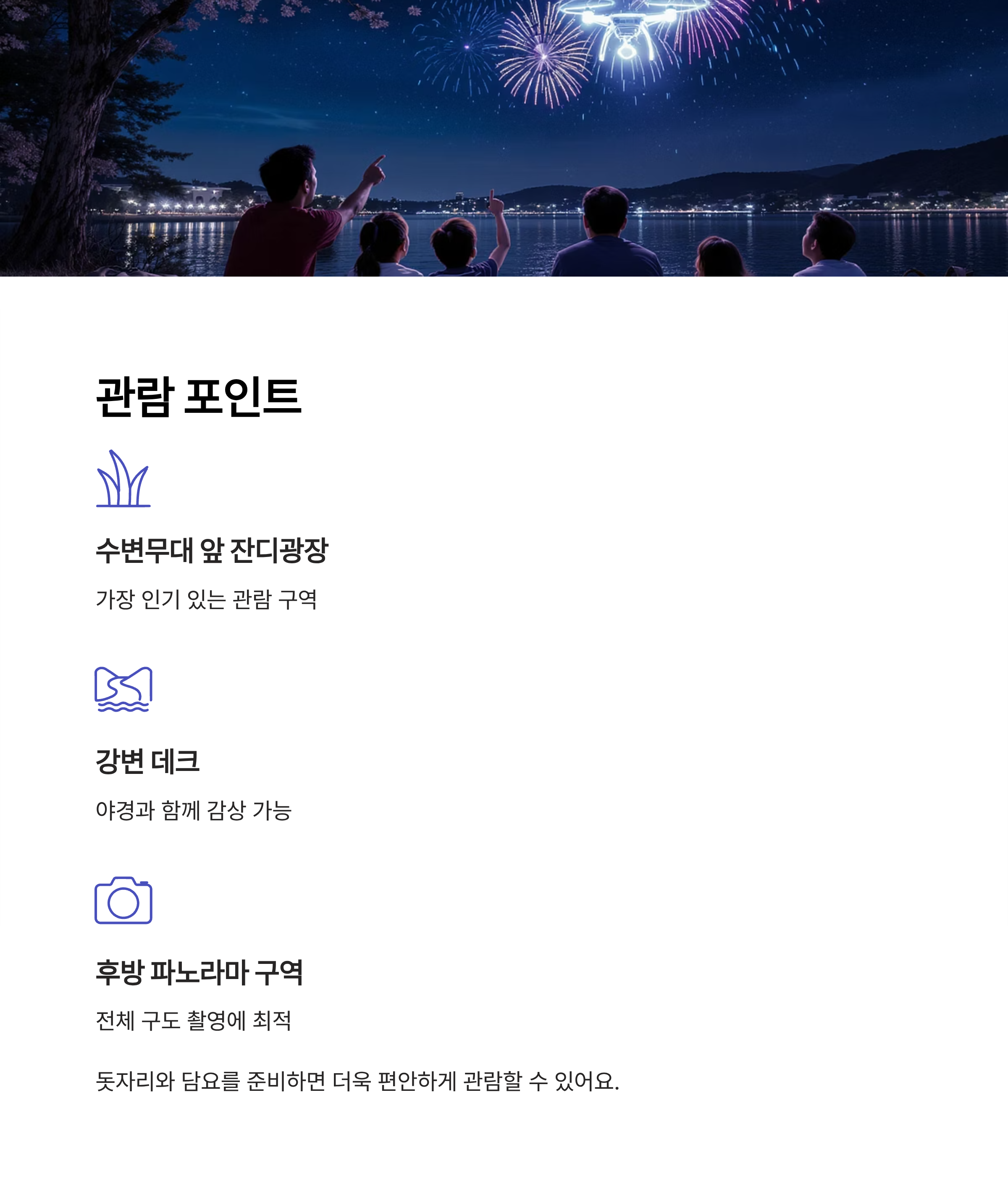 정리하자면, 뚝섬한강공원에서 드론쇼를 즐기기 위한 베스트 포인트는 수변무대 앞 잔디광장, 강변 데크, 후방 파노라마 구역이에요. 돗자리나 의자, 외투를 준비하면 더욱 편안하게 공연을 감상할 수 있답니다.