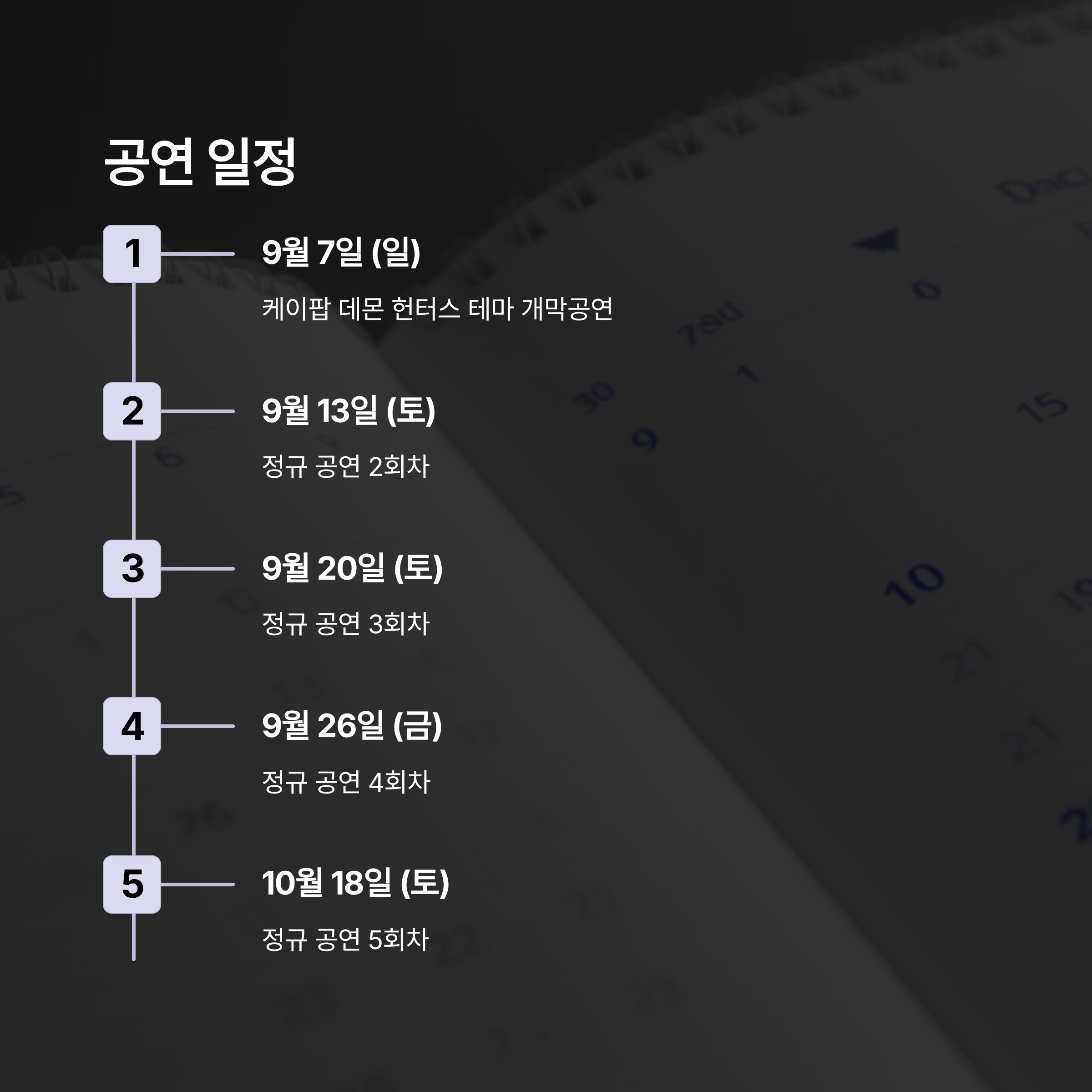 첫 공연은 9월 7일 넷플릭스 애니메이션 '케이팝 데몬 헌터스' 캐릭터를 활용한 드론 라이트쇼로 시작했어요. 이후 9월 13일, 20일, 26일, 10월 18일까지 총 5회 열리고, 10월 25일에는 서울노을공원에서 2,000대 드론이 참여하는 스페셜 공연도 예정되어 있답니다.