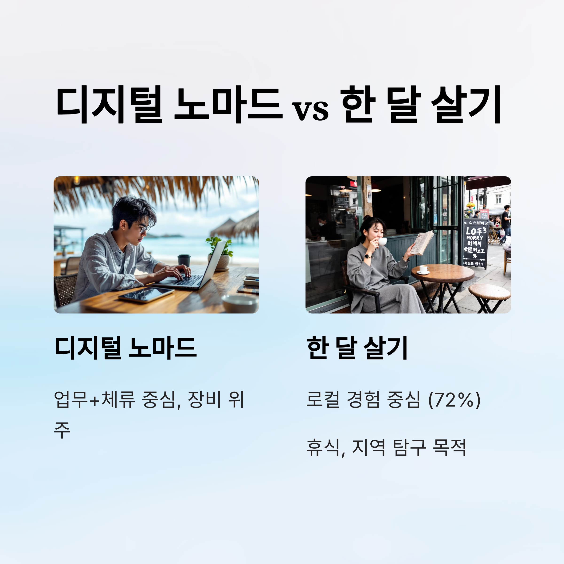 요즘은 이 둘이 혼합된 새로운 형태도 많아요. 주중엔 재택근무, 주말엔 여행자처럼 지내는 ‘워크케이션(work+vacation)’ 개념도 생겼고요. 한 달 살기를 시작했다가 디지털 노마드 라이프스타일로 전환하는 경우도 많아요.