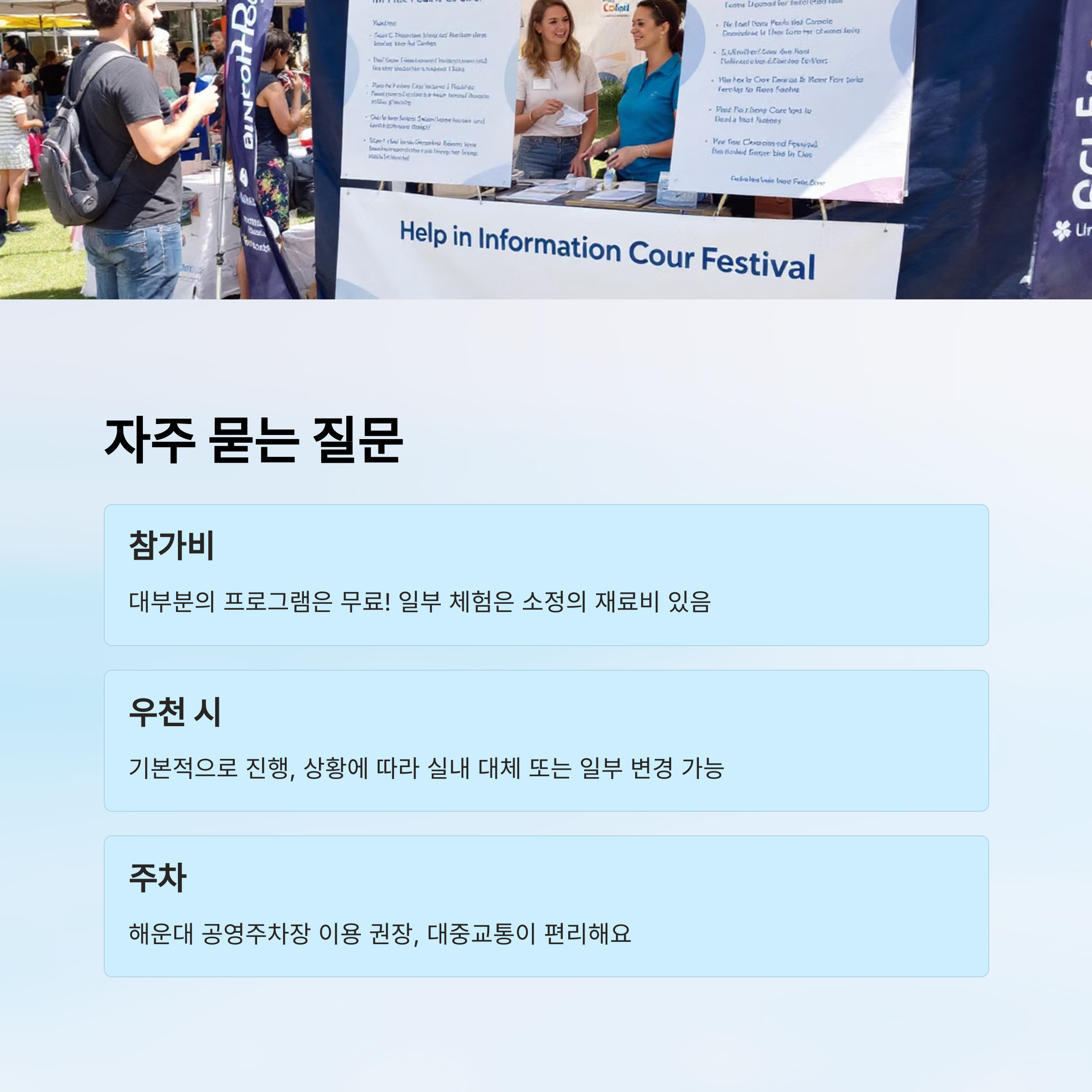 A5. 기본적으로는 우천 시에도 행사는 진행되지만, 기상 상황에 따라 실내 대체 공간으로 이동하거나 일부 프로그램이 변경될 수 있어요. 홈페이지 공지를 참고해주세요.