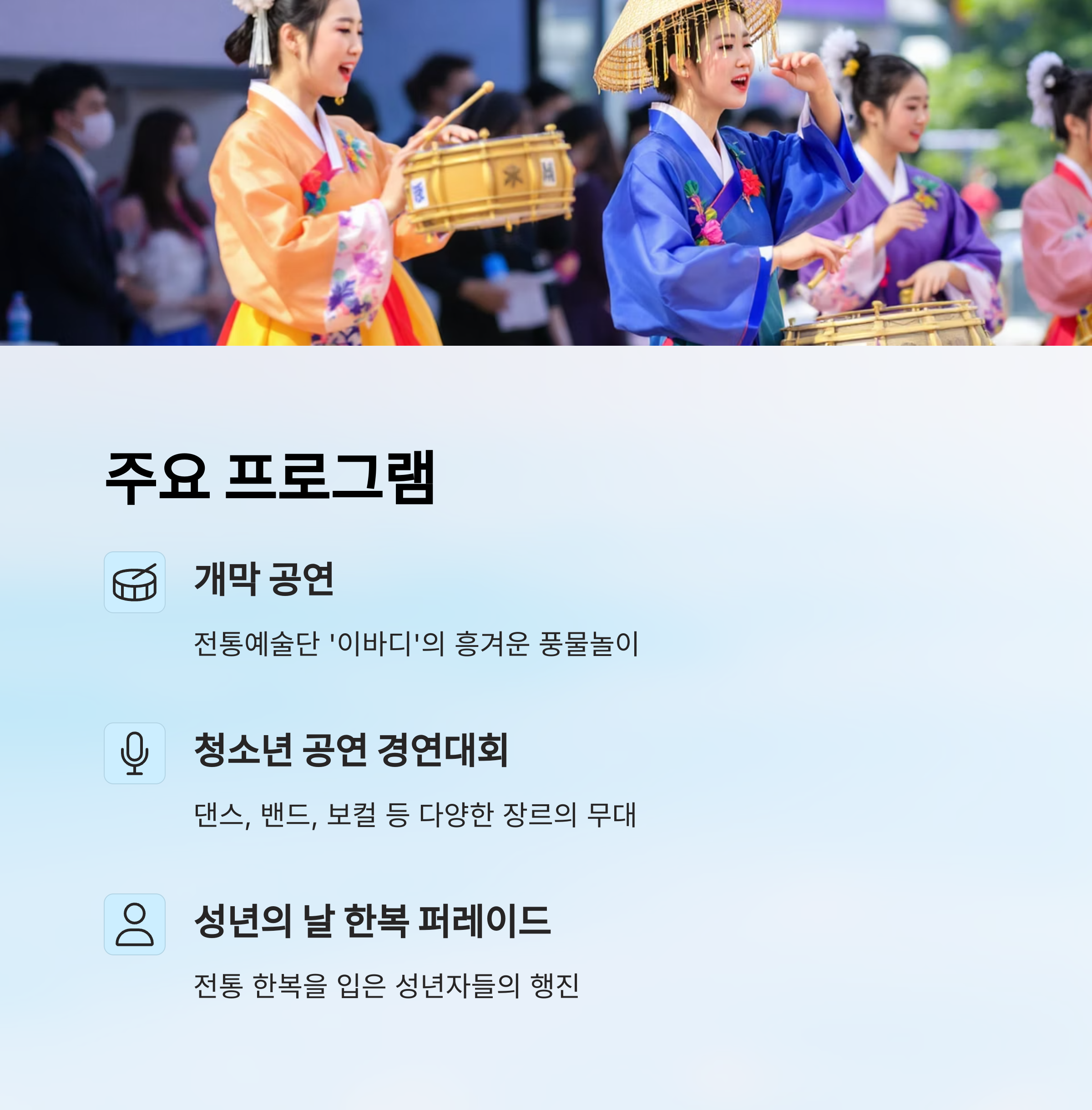 성년의 날 퍼레이드는 전통 한복을 입은 성년자들이 풍물 장단에 맞춰 행진하며 전통문화의 아름다움과 성년의 의미를 되새기는 자리예요. 축제의 중심이 되는 퍼포먼스이며, 많은 관객의 주목을 받을 예정이에요.