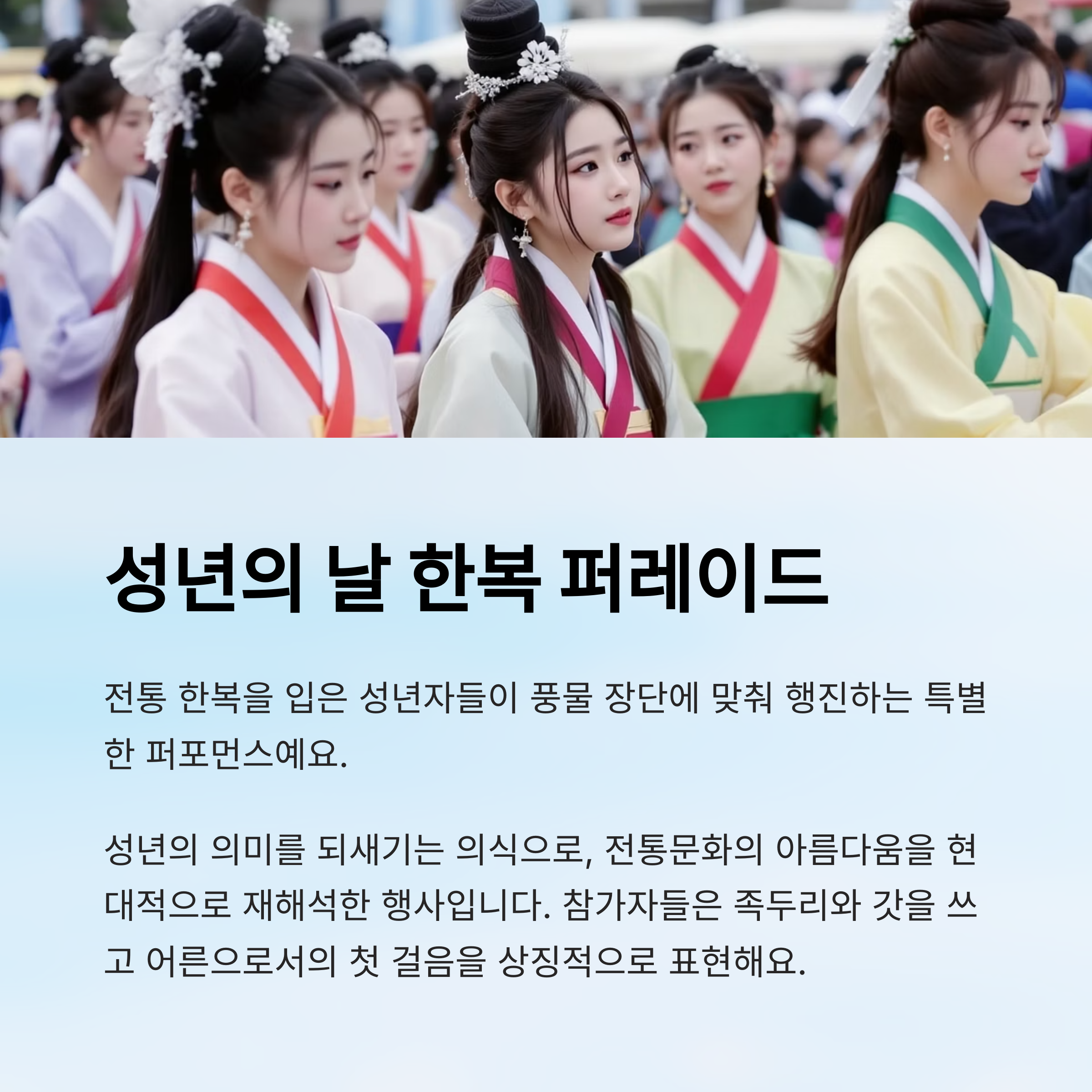 이 퍼레이드는 단순한 행진이 아니라, 전통문화와 성년의 의미를 동시에 전달하는 의식이에요. 성년을 맞은 청소년들이 곱게 차려입은 한복은 과거 '성년례'의 현대적 재해석이기도 하죠. 족두리를 쓴 청년, 갓을 쓴 남성들이 모여 어른으로서의 첫 걸음을 상징적으로 표현해요.