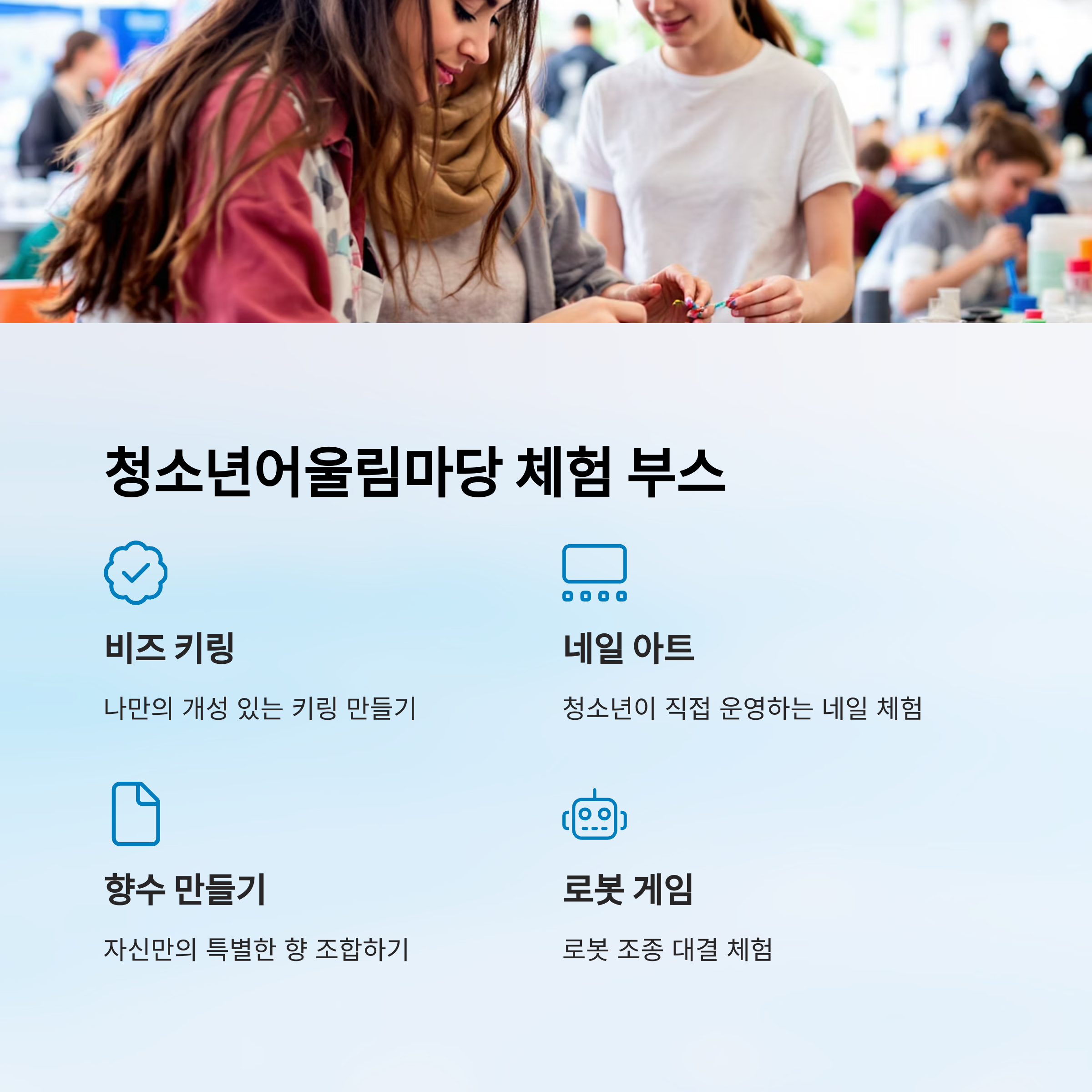 대표 체험으로는 비즈 키링 만들기, 네일 아트 체험, 향수 제작, 로봇 조종 게임 등이 있어요. 이 모든 부스는 청소년 스스로 운영하며, 창의적인 아이디어와 자신감이 느껴지는 공간이기도 해요.