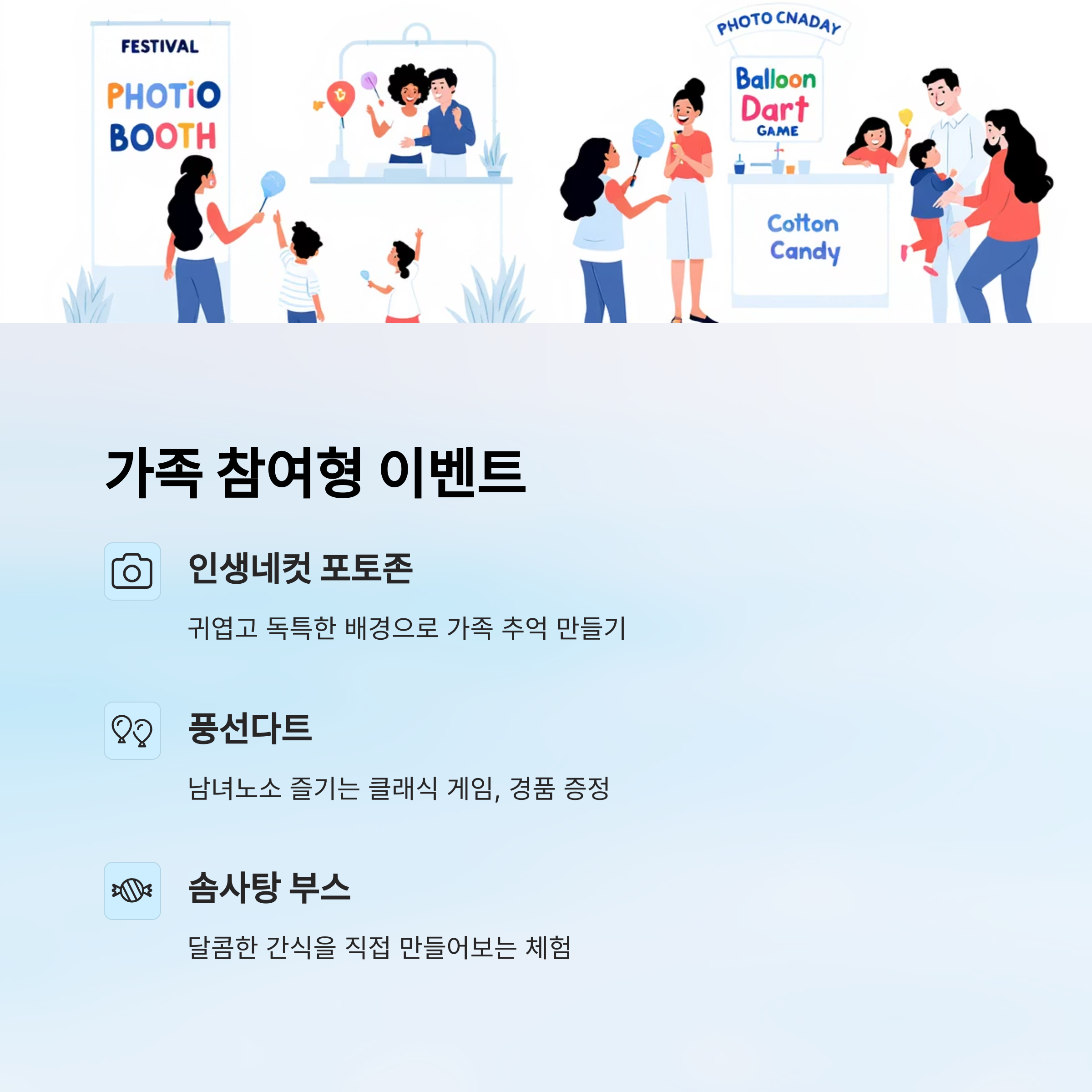 또한 ‘인생네컷’ 포토부스, 풍선다트, 솜사탕 부스처럼 누구나 쉽게 즐길 수 있는 프로그램도 많아 방문자들의 만족도를 높이고 있어요. 이런 다양한 콘텐츠가 함께 어우러져 진짜 축제 분위기를 만들어줘요!