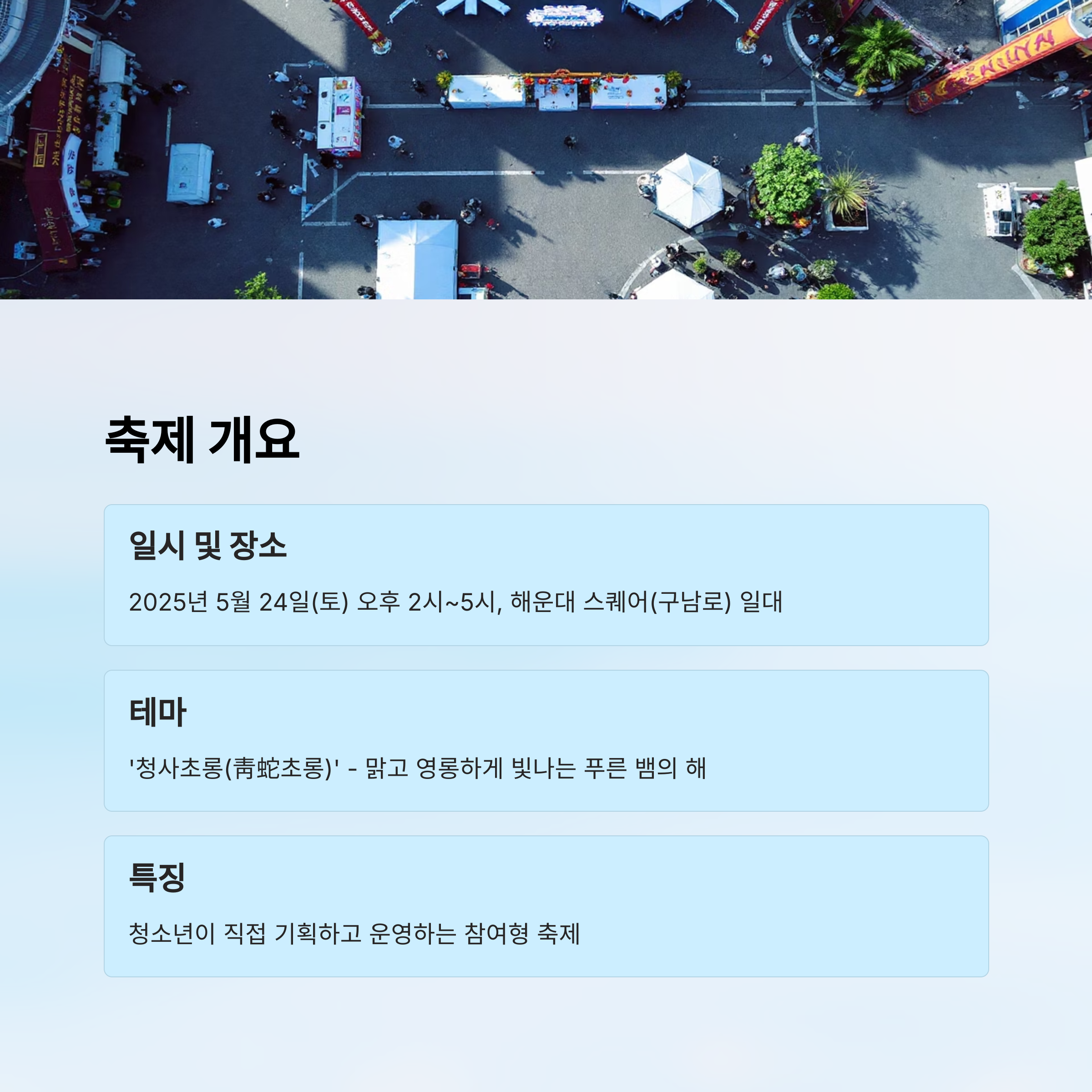 제8회 해운대청소년축제가 돌아왔어요! 🎉 2025년 5월 24일 토요일 오후 2시부터 5시까지, 해운대 스퀘어(구남로) 일대가 청소년들의 열정으로 물들게 될 예정이에요. 올해 축제의 테마는 ‘청사초롱(靑蛇초롱)’, 맑고 영롱하게 빛나는 푸른 뱀의 해를 의미하며, 성년을 맞이한 청소년들에게 의미 있는 시간을 선사하고자 해요.