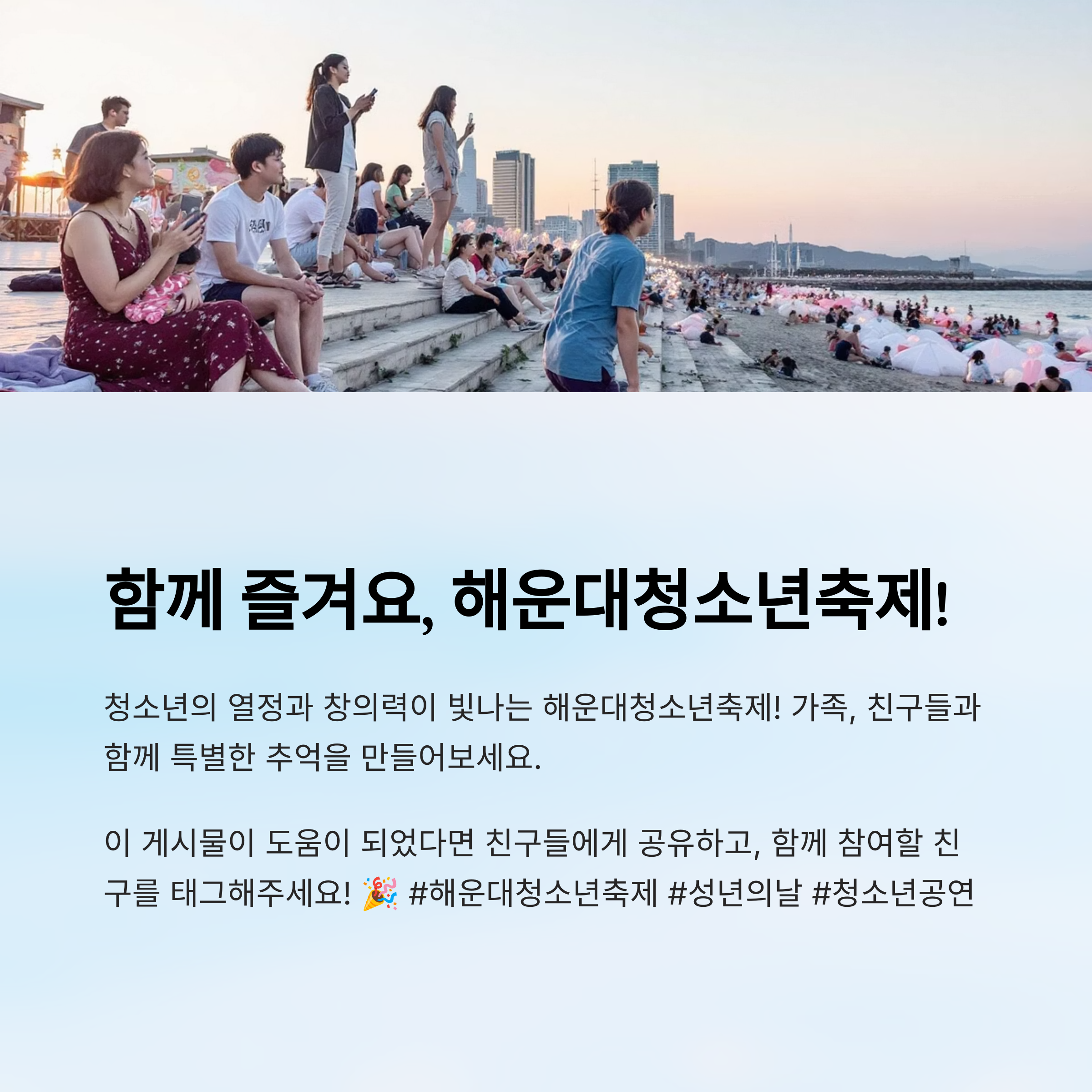 제8회 해운대청소년축제가 열립니다! 푸른뱀의 해, 맑고 영롱하게 빛나는 청소년 성년의 날 축하행사 청소...